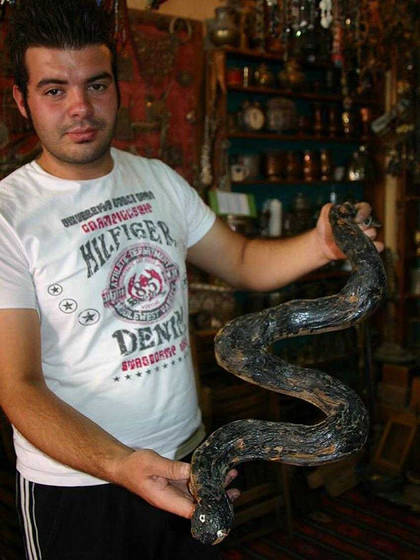 Nevşehir’in merkez ilçeye bağlı Uçhisar beldesinde antikacılık yapan Mehmet Yoğuran, yaklaşık 10 yıl önce satın aldığı kafa ve göz yapısı ile diğer aksamı ile tıpatıp bir yılanı anımsatan üzüm kütüğünün işyerine gelenlerin büyük beğenisini topladığını söyledi.
