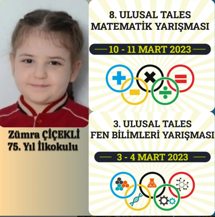 75.Yıl İlkokulu 3.sınıf öğrencilerinden Zümra Çiçekli, Ulusal ve Uluslararası Tales sınavlarında büyük bir başarıya imza atarak Türkiye finaline kaldı.
