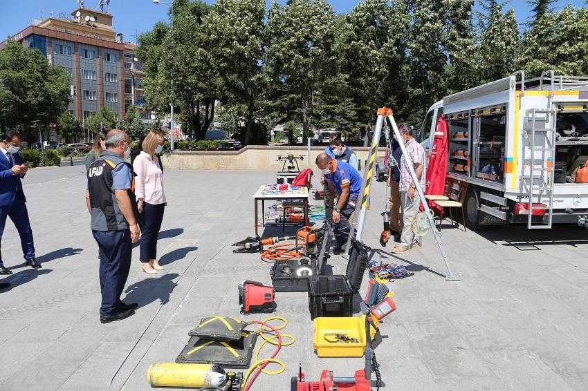 Nevşehir Valiliği Hükümet Konağı meydanında açılan standı ziyaret eden Nevşehir Valisi İnci Sezer Becel, kurulan stantta acil durumlarda havadan olay alanını görüntülemede kullanılan insansız hava aracı, beton kırma aletleri, kazalarda kullanılan kesme ve ayırma makineleri ile kapalı mekânlarda oluşan pis havayı dışarı atmaya yarayan pervaneleri ve bazı arama kurtarma aletlerini inceledi.