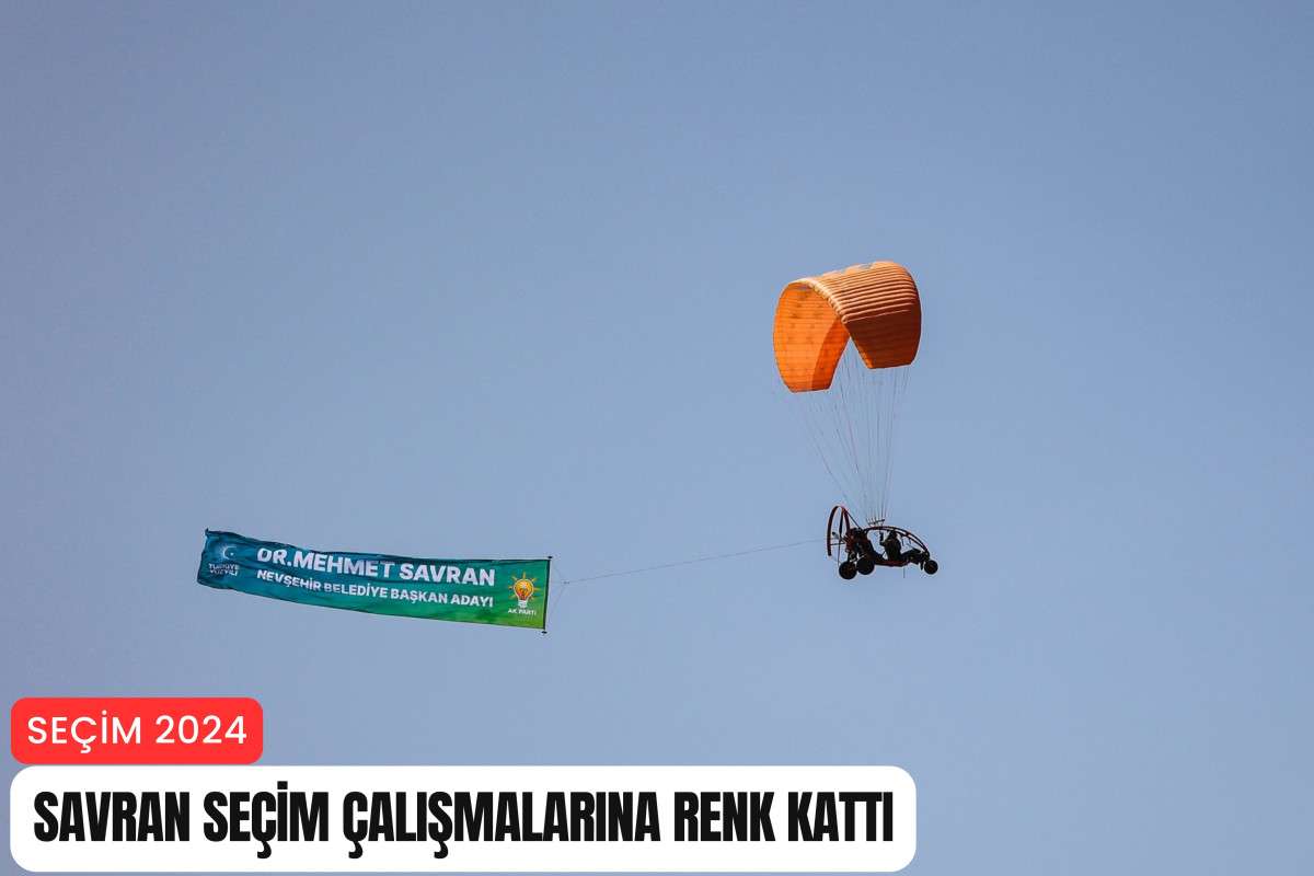AK Parti Nevşehir Belediye Başkan Adayı Dr. Mehmet Savran’ın seçim afişi paramotorla şehrin üzerinde uçuruldu. Bu gösteri, seçim atmosferine yeni bir soluk getirdi.