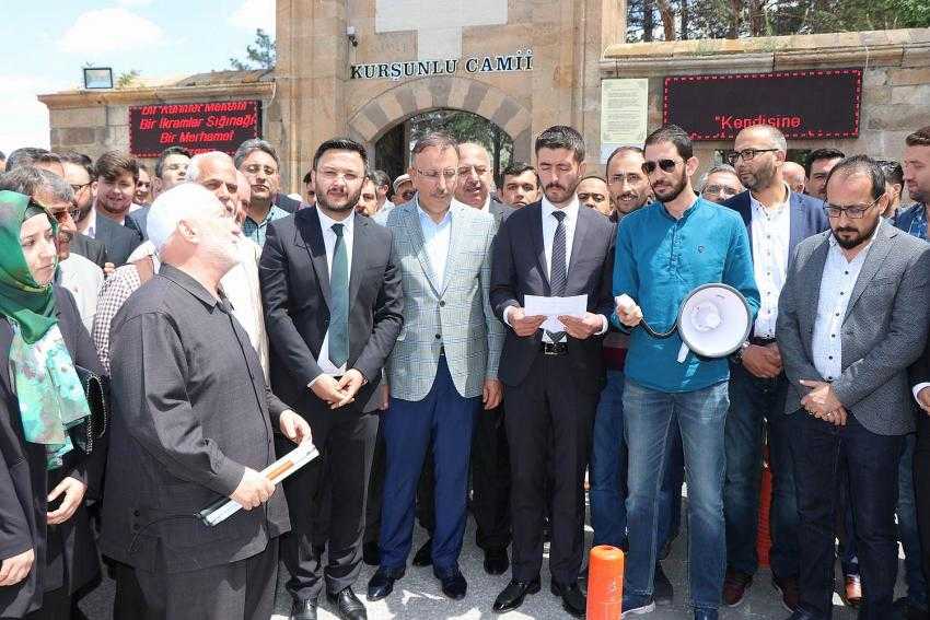 AK Parti İl Başkanlığı tarafından öğle namazı sonrasında Kurşunlu Caminde düzenlenen basın açıklaması ile İsrail ve ABD protesto edildi. AK Parti İl Başkanı Mustafa Rauf Yanar’ın yanı sıra Nevşehir Belediye Başkanı Atilla Seçen, Belde Belediye Başkanları, AK Parti Merkez İlçe Başkanı Edip Avşar ve partililerin katıldığı basın açıklamasını AK Parti Gençlik Kolları Başkanı Ahmet Dolaşmaz yaptı. Gençlik Kolları Başkanı Dolaşmaz burada yaptığı basın açıklamasında, “Amerika Birleşik Devletleri’nin Büyükelçiliğini Kudüs’e taşımasını, İslam’ın ilk kıblesi, kadim Kudüs’ü İsrail’in başkenti olarak tanıma girişimini kabul etmemiz mümkün değildir. Bu girişim bizim için yok hükmündedir. ABD bu girişimiyle BM’yi, BM kararlarını ve uluslararası hukuku açıkça hiçe saydığını göstermiş, bölgedeki ihtilafın çözümünde bir arabulucu değil açıkça bir taraf olduğunu ilan etmiştir. Kudüs’ün, gerek Birleşmiş Milletler kararlarıyla, gerekse uluslararası antlaşmalarla garanti altına alınmış statüsünü değiştirecek her türlü adımdan şiddetle kaçınılması şarttır. BM Genel Kurulu’nun ve İslam İşbirliği Teşkilatı’nın Kudüs konusundaki son kararları ortadayken, ABD’nin hayata geçirdiği bu sorumsuz ve hukuksuz girişim, Ortadoğu’da kanı ve gözyaşını artırmaktan, kaosu derinleştirmekten başka bir amaca hizmet etmeyecektir. Çok güçlü uluslararası meşruiyeti olan bunca karara rağmen hakları ihlal edilen Filistinli kardeşlerimizin, onurlu davalarını savunurken İsrail’in eli kanlı katilleri tarafından şehit edilişini içimiz kan ağlayarak takip ettik. İsrail’in, şu ana kadar 55 Filistinli kardeşimizin şehadeti ve binlerce masum kardeşimizin yaralanmasıyla sonuçlanan eylemlerini şiddetle kınıyoruz. ABD ve İsrail’in, coğrafyamızın gözbebeği ve barışın şehri olan mukaddes Kudüs’ü kana bulamasını, uluslararası hukuku vahşice çiğnemesini en güçlü şekilde lanetliyoruz. İsrail’e, böyle devam etmesi halinde, eninde sonunda akıttığı masum kanlarında boğulacağını bir kez daha hatırlatıyoruz. Kudüs Müslümanların kırmızı çizgisi, insanlığın kadim silueti, bağımsız Filistin Devleti’nin başkentidir. Filistin ve Filistinliler asla yalnız değildir. Türkiye, Cumhurbaşkanımızın öncülüğünde mazlumun yanında durmaya, hakkın, adaletin ve vicdanın yılmaz savunucusu olmaya devam edecektir” diye konuştu.