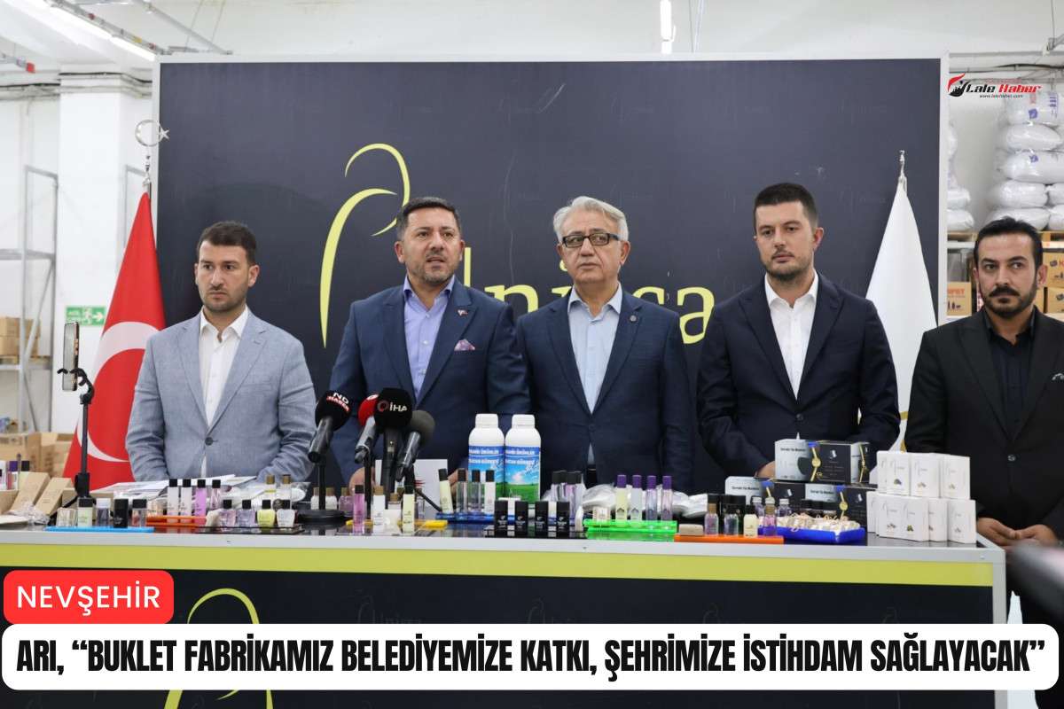 Belediye Başkanı Rasim Arı, Nevşehir Belediyesi Turizm ve Spor A.Ş bünyesinde faaliyetlerini sürdüren ve turizm sektöründeki konaklama tesisleri için terlik, şampuan, sabun, duş jeli, bone ve saç kremi gibi buklet ürünlerin üretiminin gerçekleştirildiği Nissa Buklet Fabrikası’nda bir basın toplantısı düzenledi. Arı, beraberinde Belediye Başkan Yardımcıları İbrahim Yüzer, Ahmet Çöler,Hasan İler, Nevşehir Belediyesi Turizm ve Spor A.Ş Yönetim Kurulu Üyesi Hasan Hüseyin Berber ve şirket yöneticileri ile birlikte gerçekleştirdiği toplantıda ilk olarak gazetecilere fabrika ve üretim faaliyetleri hakkında bilgi verdi.