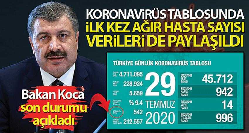 Sağlık Bakanı Fahrettin Koca, Twitter'dan yaptığı paylaşımda, “Türkiye Günlük Koronavirüs Tablosunda, bundan sonra salgın boyunca oluşan uluslararası standarda uygun olarak, ağır hasta sayısı da verilecek. Yeni ve toplam hasta sayısına ek olarak, seyir hakkında detaylı bilgi sunması için Zatürre Oranı gösterilecek” ifadelerine yer verdi.