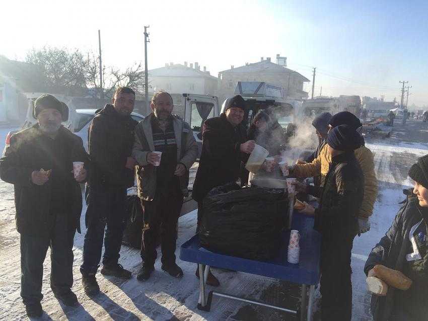 Başkan Özmen, “Gitmediğin yer, dokunmadığın gönül senin değildir diyerek eksi 12 derecede helal rızkının peşinde koşan esnaflarımıza bir nebze faydamız olurumu diyerek bu gün Derinkuyu pazarında idik. Sıcak çorba ikram ederek Gönüllerine dokunmaya çalıştık. Rabbim yar ve yardımcıları olsun” dedi.