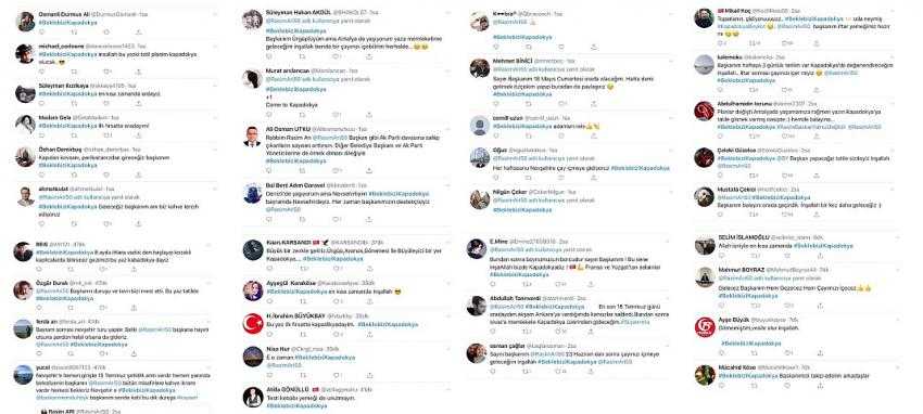 Arı’nın bu paylaşımı kısa sürede Twitter’da TT oldu. #Kapadokyaboykot hashtagi ile Türkiye’nin dört bir yanından mesajlarını gönderen sosyal medya kullanıcıları Belediye Başkanı Rasim Arı’ya destek vererek Kapadokya’yı gezmeye geleceklerini ve Nevşehir Belediyesini ziyaret edeceklerini söyledi.