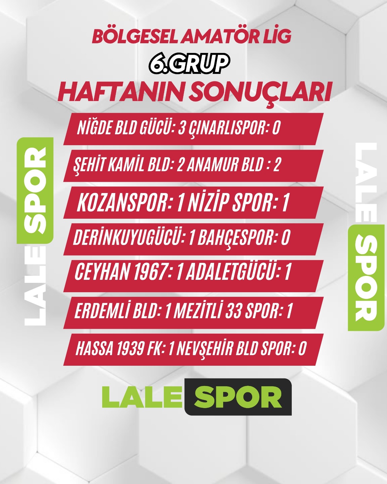 Bölgesel Amatör Lig 6.Grupta 2025-2026 futbol sezonu bugün oynanan karşılaşmalar ile başladı. Sezonun ilk haftasında Niğde Belediyegücü, Derinkuyugücü ve Hassa 1939 FK takımları galip gelerek 3 puan kazanırken 4 karşılaşma ise beraberlikle sonuçlandı.