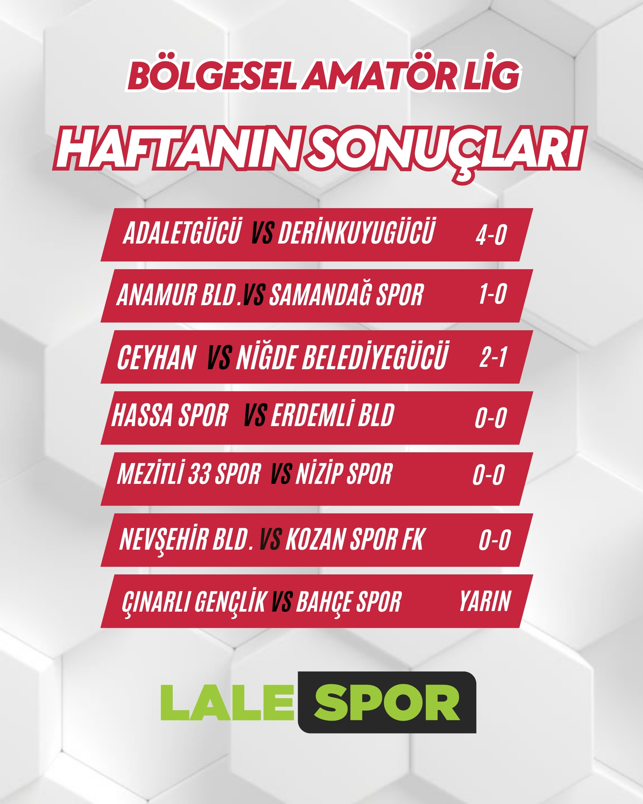 Bölgesel Amatör Lig 6.Grupta 6.hafta bugün oynanan maçlar ile tamamlandı. Derinkuyugücü deplasmanda konuk olduğu Adaletgücü’ne 4-0 mağlup olurken Nevşehir Belediyespor ise Gazi Stadyumunda konuk ettiği Kozanspor FK ile 0-0 berabere kalarak ligdeki ilk puanını aldı.