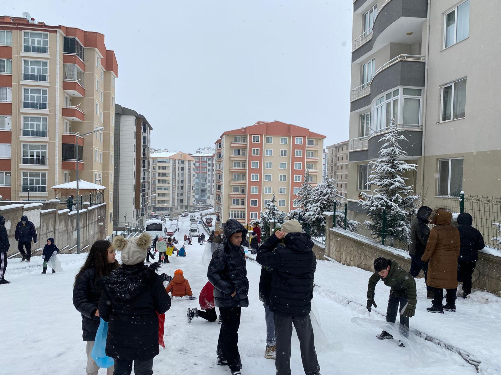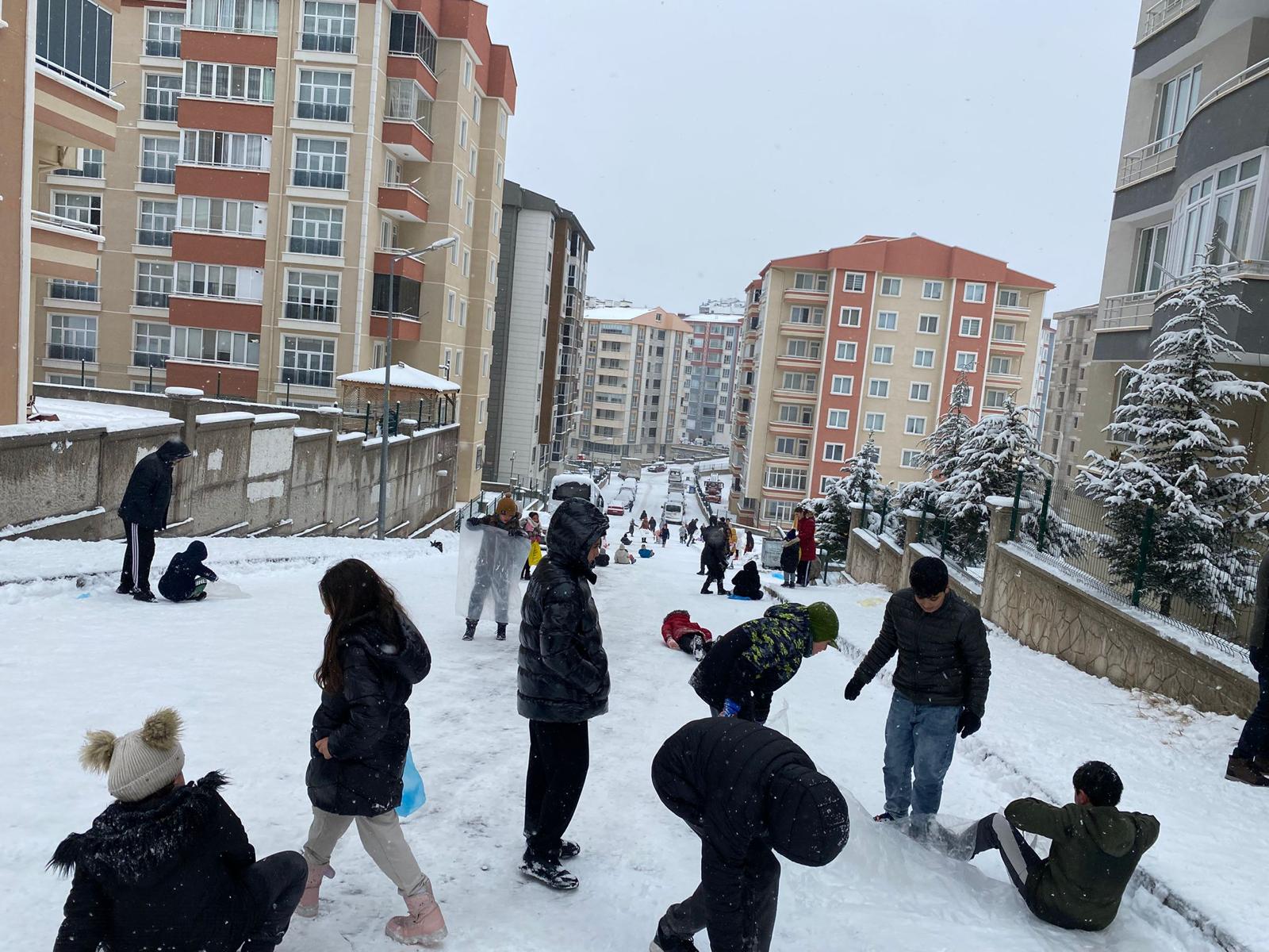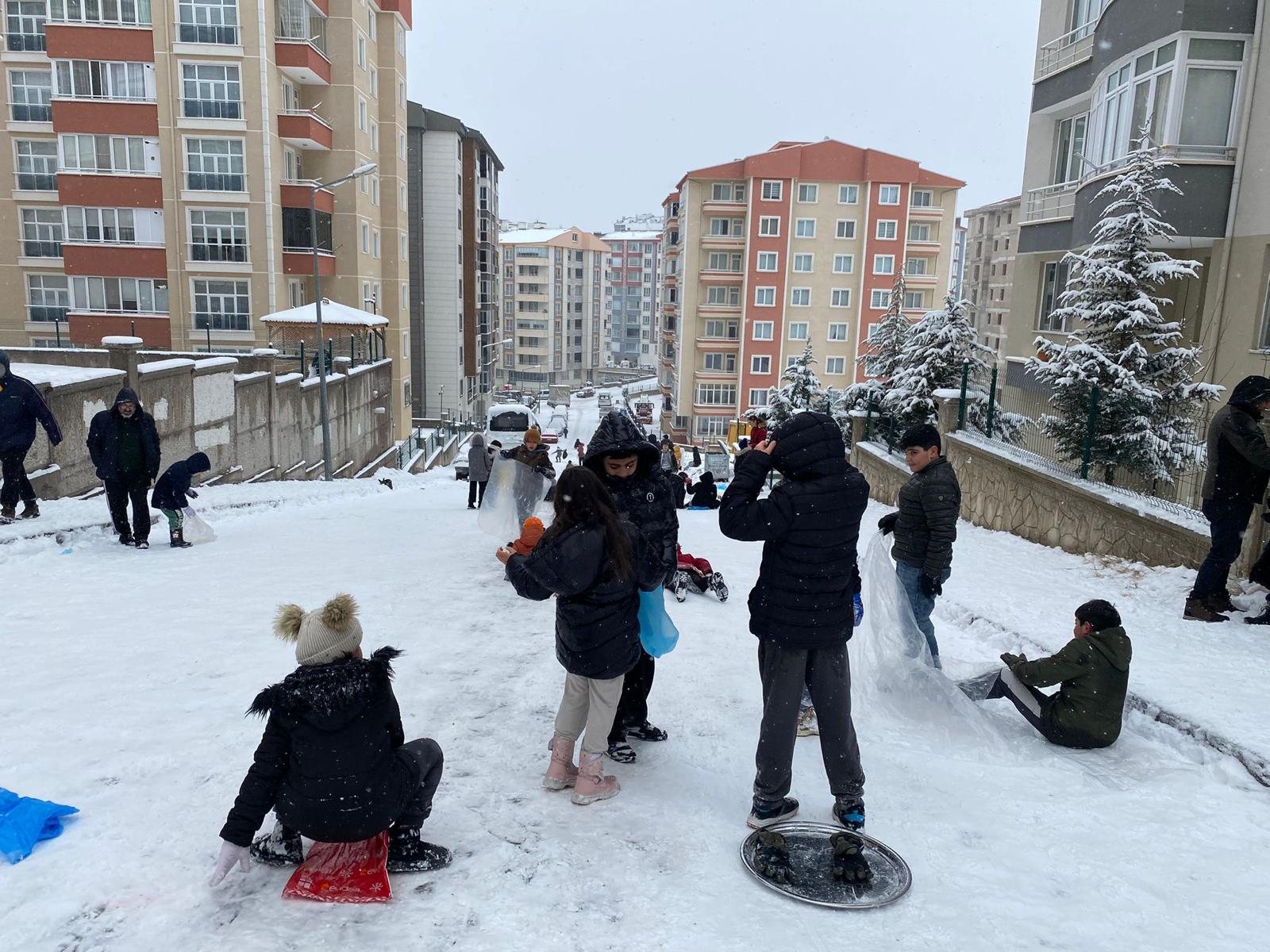Nevşehir’de gece saatlerinden itibaren başlayan kar yağışı ile birlikte çocuklar karın keyfini çıkartmaya başladı. Cevherdudayev Mahallesi Ayışığı sokakta onlarca çocuk evlerinden getirdikleri poşetler ile yolda kaymanın mutluluğunu yaşadı.