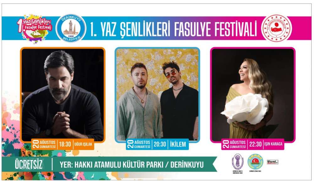 Derinkuyu Belediyesi’nin ev sahipliğinde 1.Yaz Şenlikleri Fasulye festivali düzenlenecek. 20 Ağustos Cumartesi günü düzenlenecek olan programda Uğur Işılak, İkilem ve Işın Karaca konseri düzenlenecek. Hakkı Atamulu Kültür Parkı’nda düzenlenecek olan festivali tüm Nevşehir halkını davet eden Derinkuyu Belediye Başkanı Bülent Aksoy bu yıl ilkini düzenleyeceğimiz 1.Yaz Şenlikleri ve Fasulye festivalimiz eğlenceli ve dolu dolu geçecek dedi.