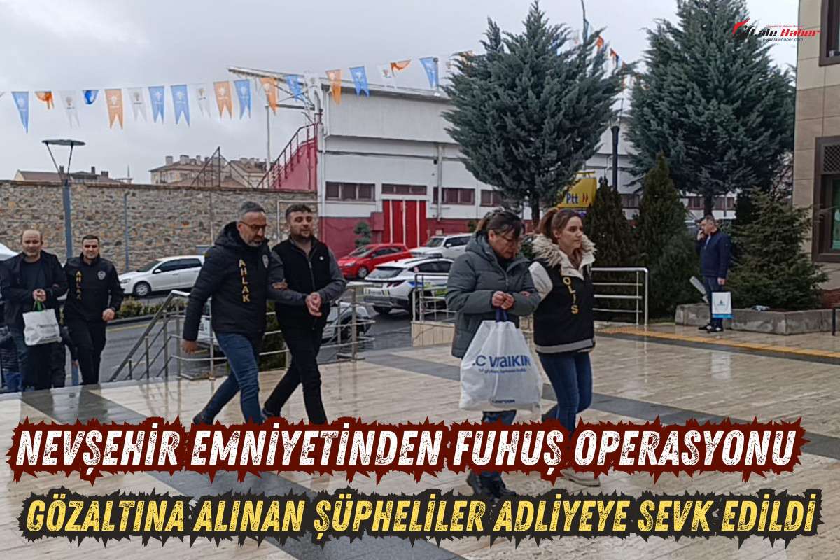 Nevşehir İl Emniyet Müdürlüğü Asayiş Şube Müdürlüğü ekiplerince Nevşehir merkezli 4 ilde düzenlenen eş zamanlı fuhuş operasyonu sonrasında gözaltına alınan şüpheliler emniyetteki işlemlerinin tamamlanmasının ardından adliyeye sevk edildi.