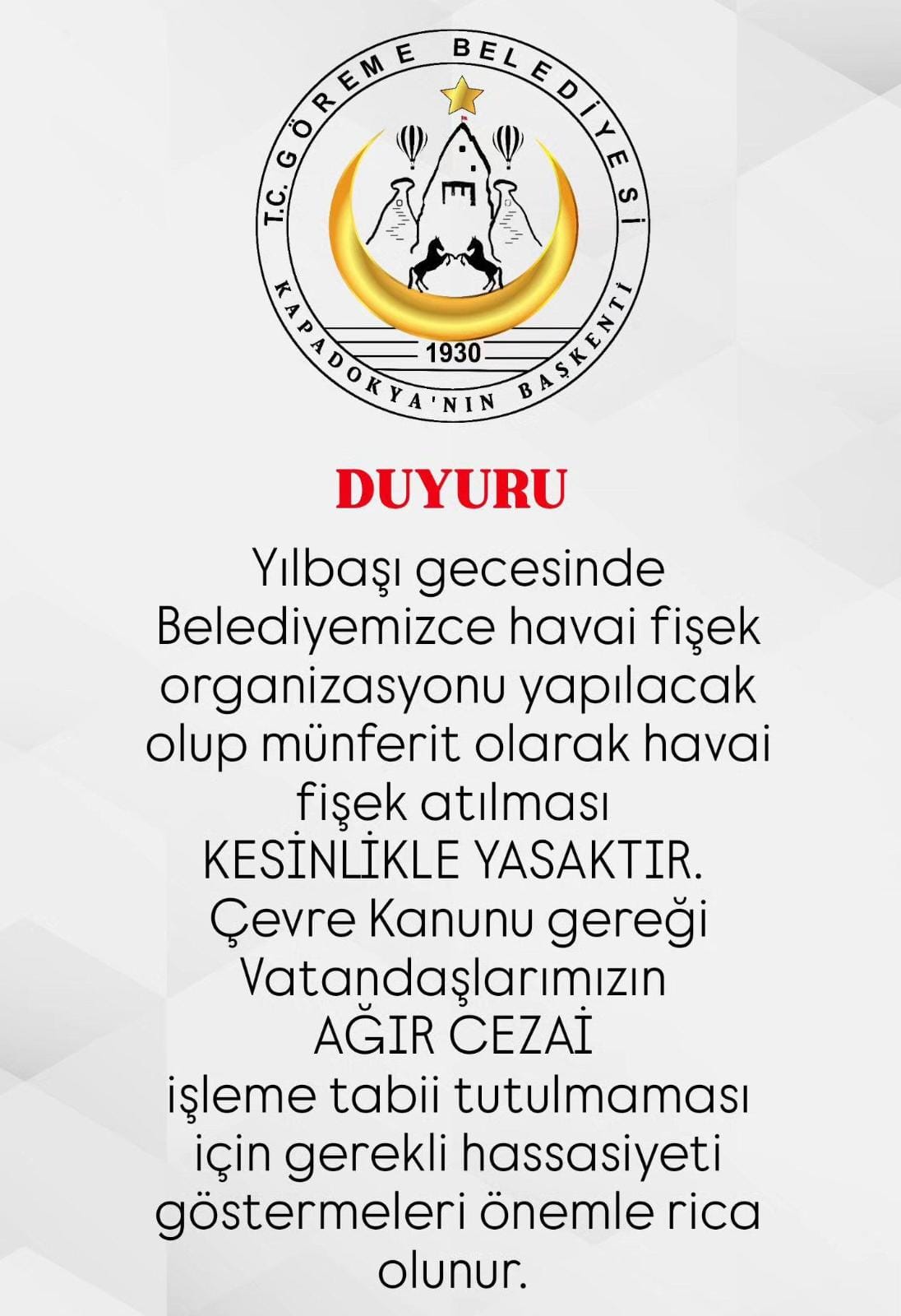 Göreme Belediyesi, yaklaşan yılbaşı gecesi için önemli bir duyuru yayımladı. Belediyeden yapılan açıklamada, yılbaşı gecesi sadece belediye tarafından organize edilecek havai fişek gösterisine izin verileceği belirtildi.