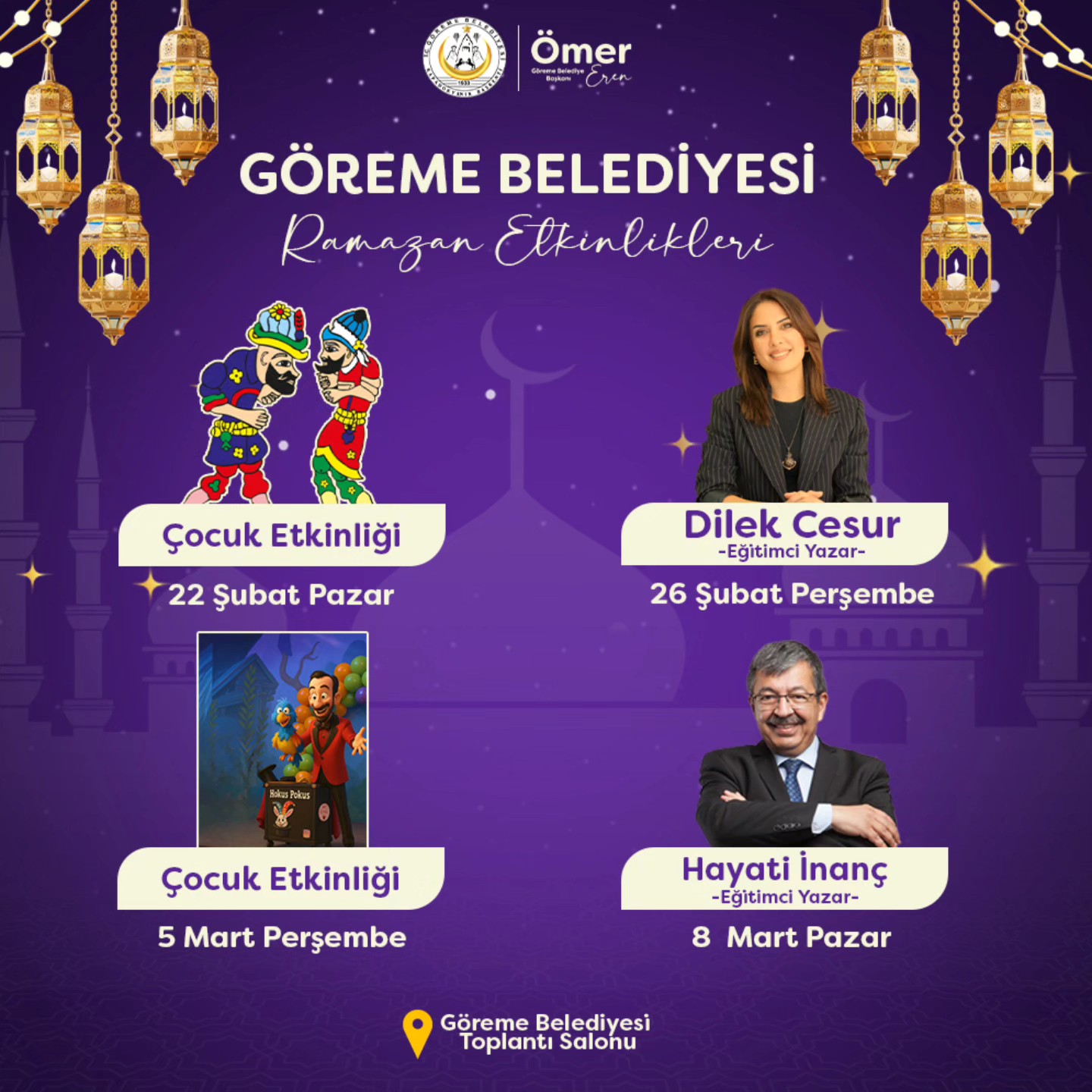 Göreme Belediyesi tarafından yapılan açıklamada, “ Ramazan ayı boyunca düzenlenecek tüm etkinlikler, Göreme Belediyesi Toplantı Salonu’nda ücretsiz olarak gerçekleştirilecektir. Etkinlik saatleri ve iftar programlarına ilişkin detaylı bilgiler, ilerleyen günlerde resmi sosyal medya hesaplarımızdan paylaşılacaktır. Ramazan’ın huzurunu ve bereketini birlikte yaşamak için tüm halkımız davetlidir” denildi.