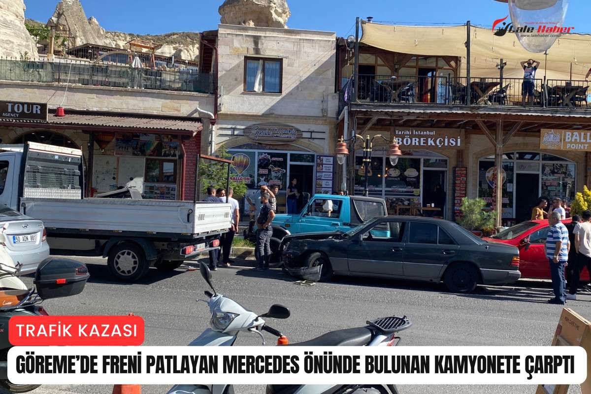 Alınan bilgilere göre, Göreme açık Hava Müzesi yolunda seyri halinde olan Mercedes marka otomobilin freni patladı. Freni patlayan otomobil sürücüsü direksiyon hakimiyetini kaybetmesi sonrasında önünde bulunan mini kamyonete çarparak durabildi. Kazada yaralanan olmazken otomobilde maddi hasar meydana geldi.
