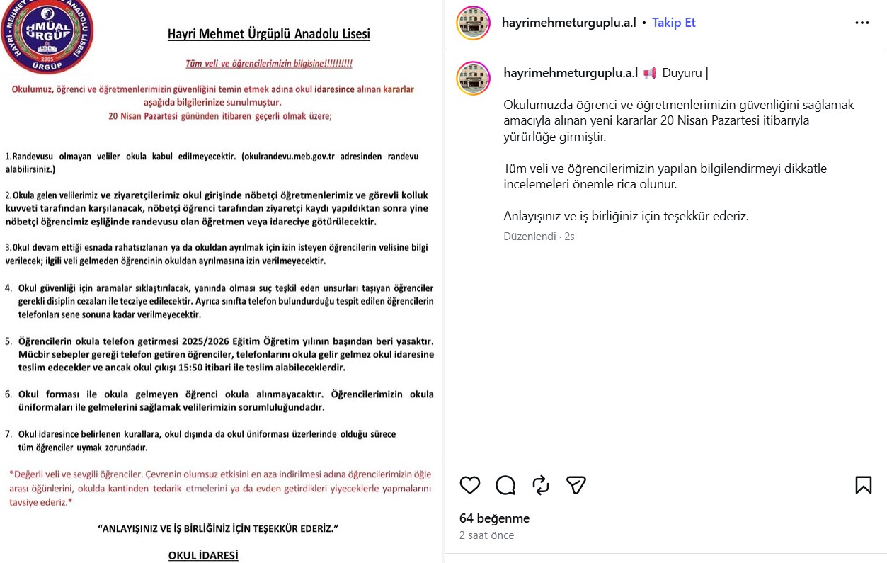 Nevşehir’in Ürgüp ilçesinde bulunan Hayri Mehmet Ürgüplü Anadolu Lisesi, öğrenci ve öğretmenlerin güvenliğini artırmak amacıyla yeni bir dizi uygulamayı hayata geçiriyor. Okul idaresi tarafından alınan kararların, 20 Nisan Pazartesi günü itibarıyla yürürlüğe gireceği duyuruldu.