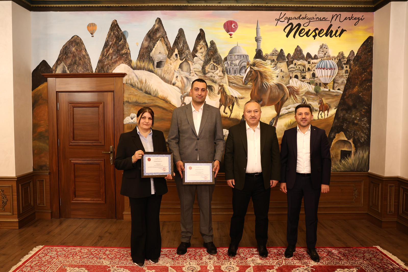 Belediye Başkanı Rasim Arı, 1001 ilmeğin atıldığı halı motifi plaketini Spor Şube Müdürü İyilikli ve Halı Atölye Hocası Turgut’la birlikte Nevşehir Valisi Ali Fidan’a takdim etti.