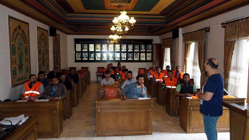 Nevşehir Belediyesi’nin öncülüğünde Nevşehir ve Kalesi civarında yürütülen arkeolojik araştırma ve temizleme çalışmalarında görev alan işçilere yönelik olarak Nevşehir Belediyesi Meclisi toplantı salonunda gerçekleştirilen İş Sağlığı ve Güvenliği eğitiminde, Nevşehir Belediyesi İş Sağlığı ve Güvenliği uzmanı Fatih Bozkurt işçilere slayt eşliğinde bilgiler verdi.