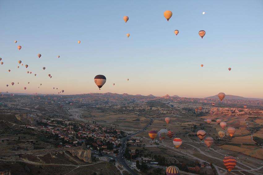 Türkiye’nin önemli turizm merkezlerinden Kapadokya bölgesinde olumsuz hava şartları nedeniyle 3 gündür yapılamayan sıcak hava balon turları bu sabah yeniden yapıldı. Yerli ve yabancı turistlerin büyük ilgi gösterdiği sıcak hava balon turlarına katılanlar yaklaşık 1 saat boyunca peribacalarını kuşbakışı izlemenin mutluluğunu yaşadı.