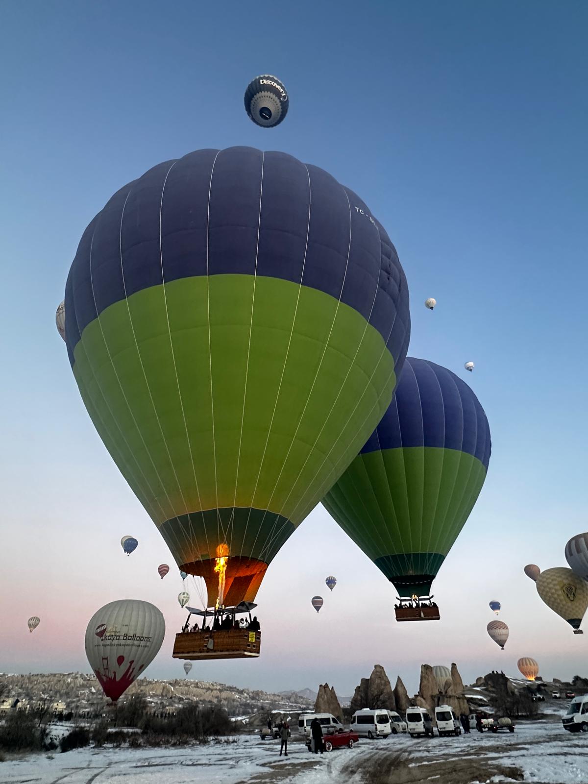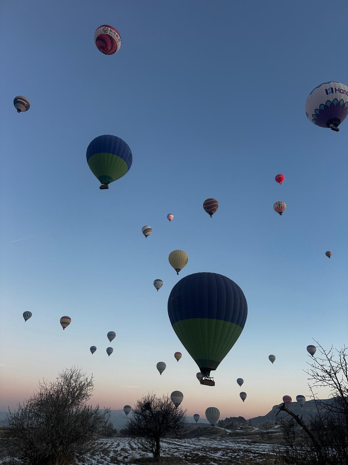 Türkiye’nin önemli turizm merkezlerinden ve sıcak hava balon turlarının başkenti Kapadokya bölgesinde gökyüzü sıcak hava balonların havalanmasıyla renkledi. Yerli ve yabancı turistler karla kaplı peribacalarını kuşbakışı izlemenin mutluluğunu yaşarken bol bol fotoğraf çekti.