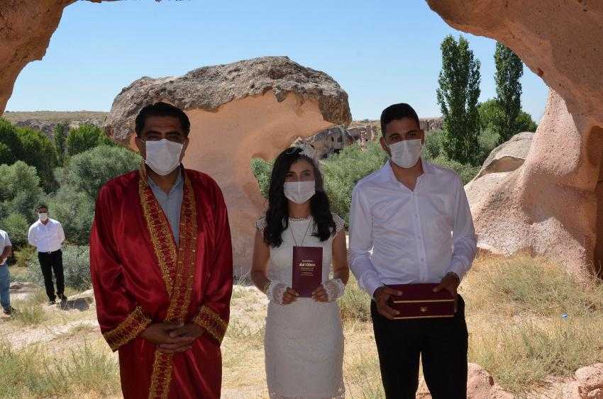 Türkiye’nin önemli turizm merkezlerinden Kapadokya bölgesinde ören yerleri çiftlerin yeni nikah mekanı oldu. Nevşehir’in Gülşehir ilçesinde dünya evine girmek için müracaat eden Ayşe ve Yasin Şimşek çifti de ilçenin sembolü olan ve Açıksaray ören yerinde bulunan Mantarkaya’da nikah töreni düzenlendi. Gülşehir Belediye Başkanı Fatih Çiftçi tarafından kıyılan nikahta genç çiftin mutlulukları gözlerinden okunurken Belediye Başkanı Fatih Çiftçi yaptığı açıklamada, Gülşehir’de Roma döneminden kalma kaya mezarları ve kiliselerin bulunduğu alanın son zamanlarda genç çiftlerin nikah merasim alanı olduğunu söyledi. Çiftçi, “ İlçemizde bulunan Açıksaray ören yerinin içerisinde bulunan ve mantar şeklini alan Mantarkaya genç çiftlerin yeni gözdesi oldu. Böylesine doğal güzellikte nikah kıymakta bizleri son derece mutlu etti. Bu doğal güzelliklerin yerinde görülmesi için herkesi ilçemize davet ediyorum” dedi. Mantarkaya’da düzenlenen nikah töreni ile dünya evine giren damat Yasin Şimşek ise burada nikah kıydırmaktan dolayı son derecem utluyuz. Herkesi Mantarkaya’yı görmeye davet ediyorum diye konuştu.