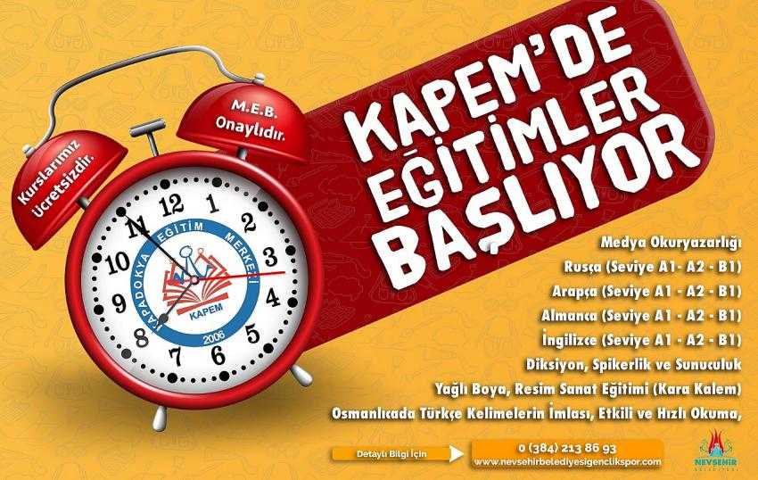 Nevşehir Belediyesi Kapadokya Eğitim Merkezi (KAPEM)’de 46. Dönem kursları 27 Eylül 2021 tarihinde başlıyor.