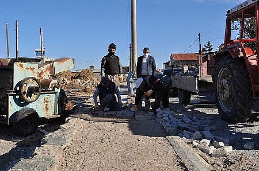 Nevşehir'in Acıgöl ilçesine bağlı Karapınar beldesinde belediyenin kaldırım düzenleme çalışmaları sürüyor.