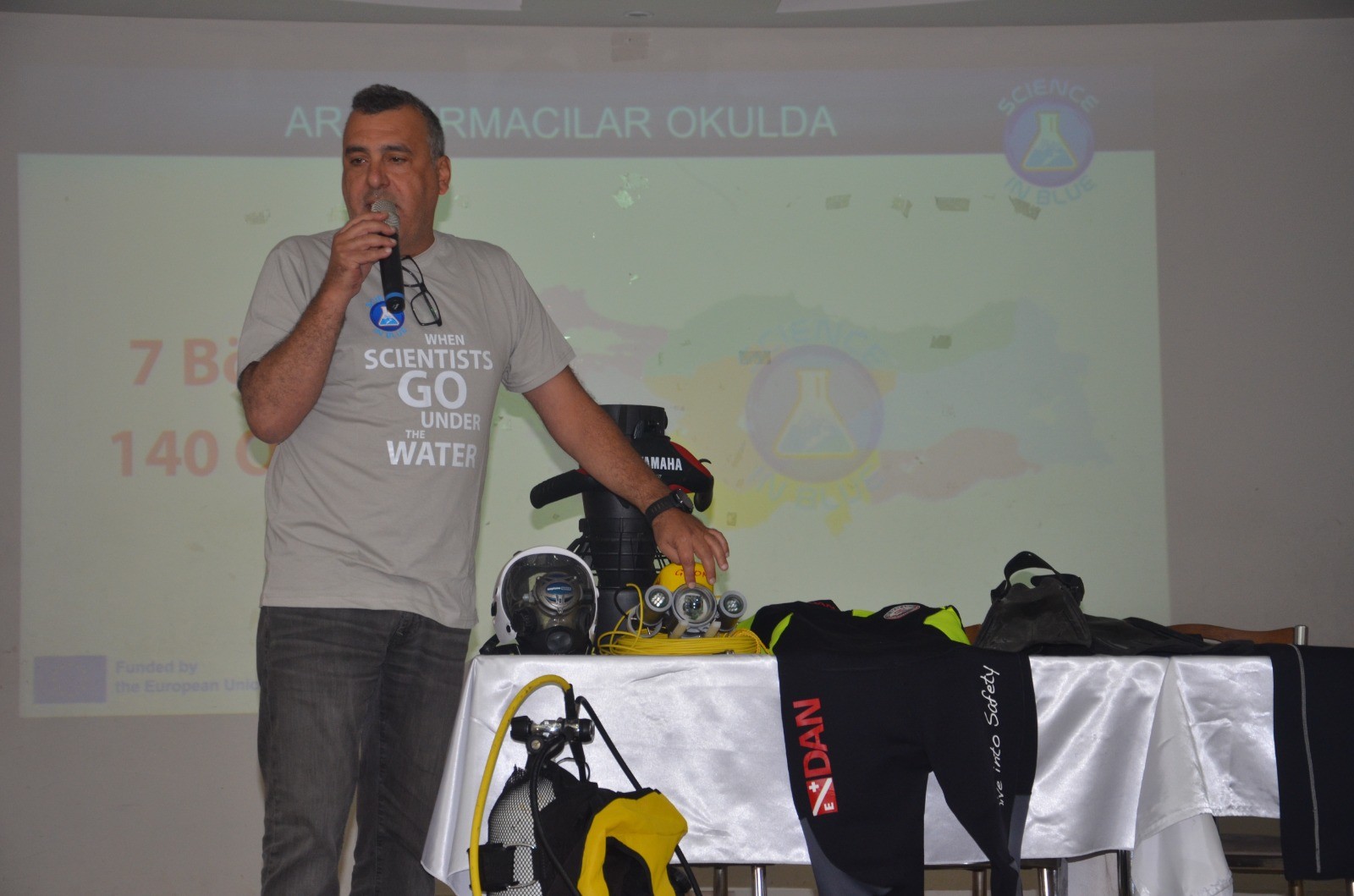 Konuşmasında projenin amacını anlatan Özyiğit, öğrencilere dalış ekipmanlarını da tanıttı.