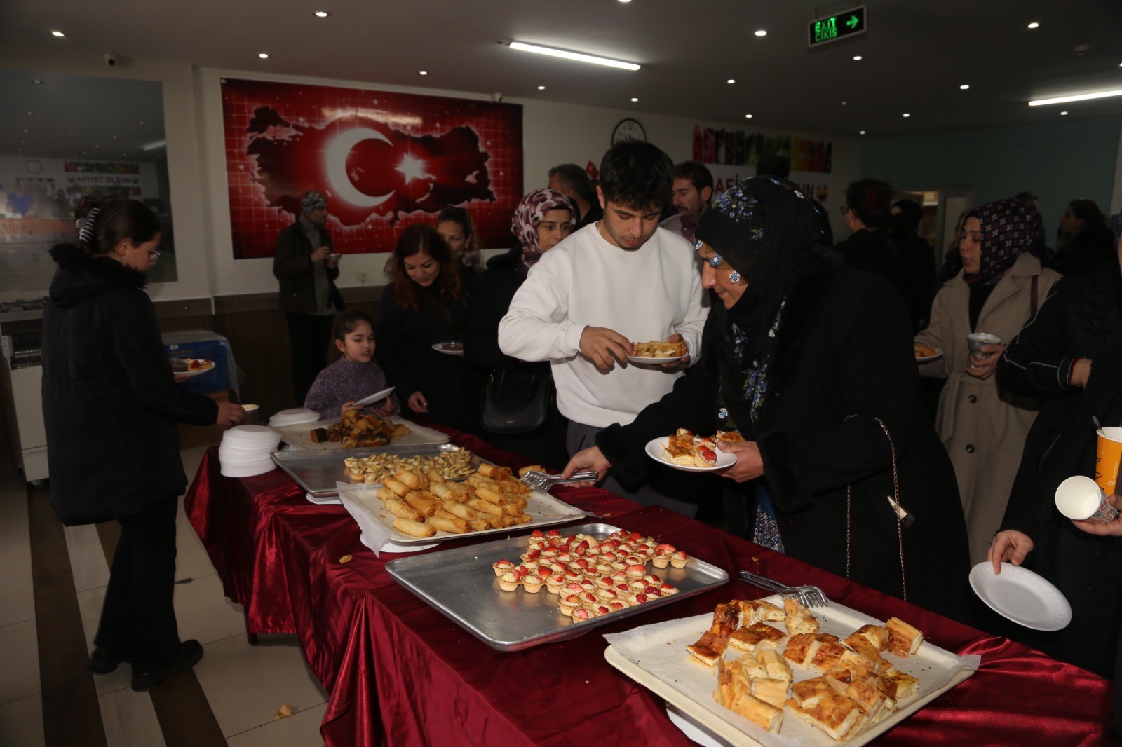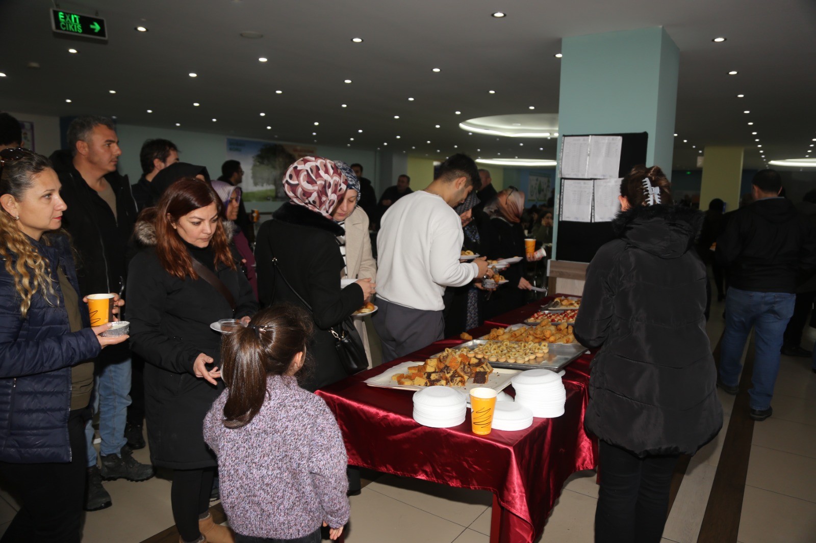 Öğrenciler sınav için sınıflara alındıktan sonra veliler de 1000 kişi kapasiteli yemekhanede misafir edildi.