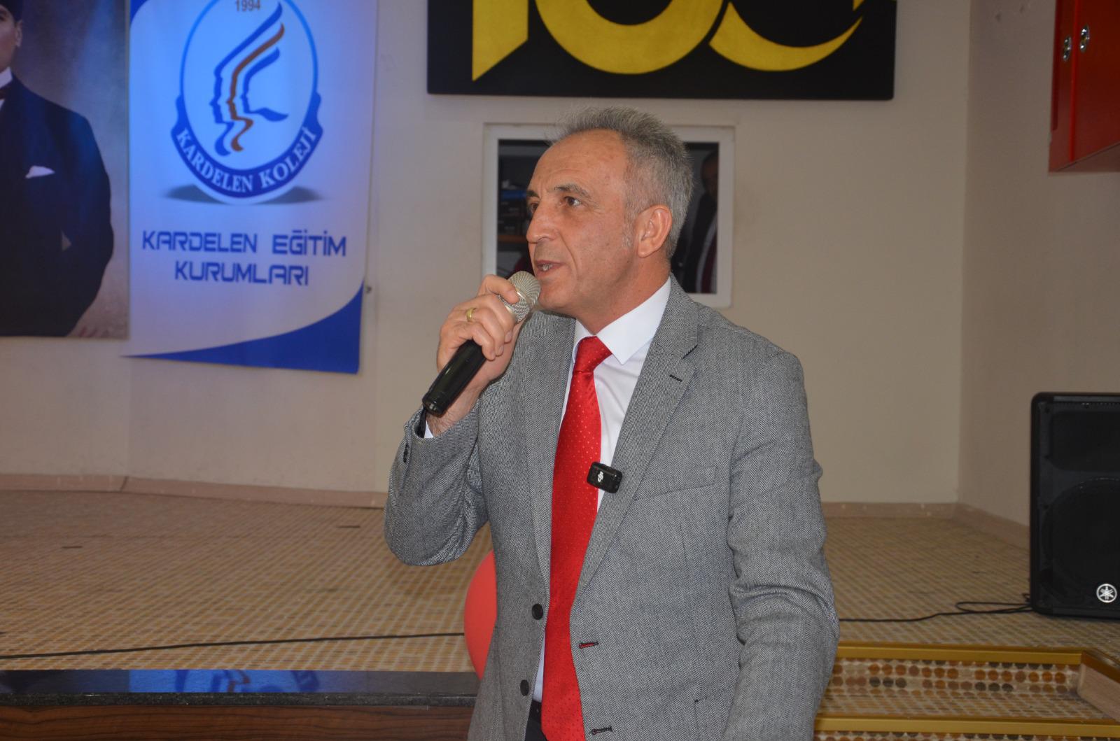 Kaynar, “Sevmiyorum o zor günlerden geçiyoruz cümlelerini. Sevmiyorum yurduma, öğrencilerime ümitsizlik aşılayan cümleleri. En zor zamanları gören bir ulusun bir ferdi olmanın gururunu yaşayan bir Türk eğitimcisi olarak diyorum ki biz ulusal egemenliğimizin, cumhuriyetimizin, Ulu Önderimizin, onun açtığı yolun onun koyduğu ilke ve inkılaplarımızın milli ve manevi değerlerimizle bezenmiş halini bu körpe beyinlere hissettirdiğimiz sürece özümsettiğimiz sürece yeni yüzyılın süper devleti olma yolunda en büyük aday biziz.” diye konuştu.