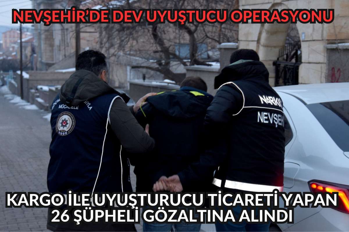 Nevşehir İl Emniyet Müdürlüğü Narkotik Suçlarla Mücadele Şube Müdürlüğü ekiplerince kargo ile uyuşturucu ticareti yapan şahıslara yönelik 3 ilde 23 adrese eş zamanlı düzenlenen operasyonlarda 26 şüpheli gözaltına alındı.