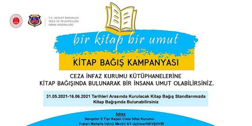 NEVŞEHİR(MHA) Adalet Bakanlığı ile Kültür ve Turizm Bakanlığı arasında 29 Mart 2021 tarihinde imzalanan ‘‘Ceza İnfaz Kurumu Yerleşkelerinde Kütüphane Kurulmasına İlişkin İş Birliği Protokolü töreninde Adalet Bakanı Abdulhamit Gül tarafından dile getirildiği üzere Ceza İnfaz Kurumu Kütüphaneleri İçin Kitap Bağış Kampanyası düzenlenecek. 31.05.2021 tarihinde Bakan tarafından yapılacak ilk kitap bağışı ile Kampanya süreci başlatılacak.