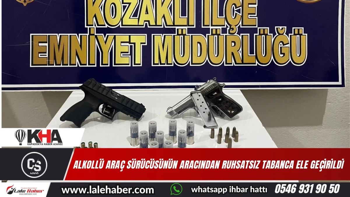 Alınan bilgilere göre, Kozaklı İlçe Emniyet Müdürlüğü ekiplerince yapılan yol kontrol uygulamasında durdurulan bir araç sürücüsünün alkollü olduğu tespit edilirken araçta yapılan aramada 2 adet ruhsatsız tabanca, 18 adet mermi ve 10 adet tüfek mermisi ele geçirildi. Araç sürücüsü polis ekiplerince gözaltına alınırken işlemlerin devam ettiği öğrenildi.