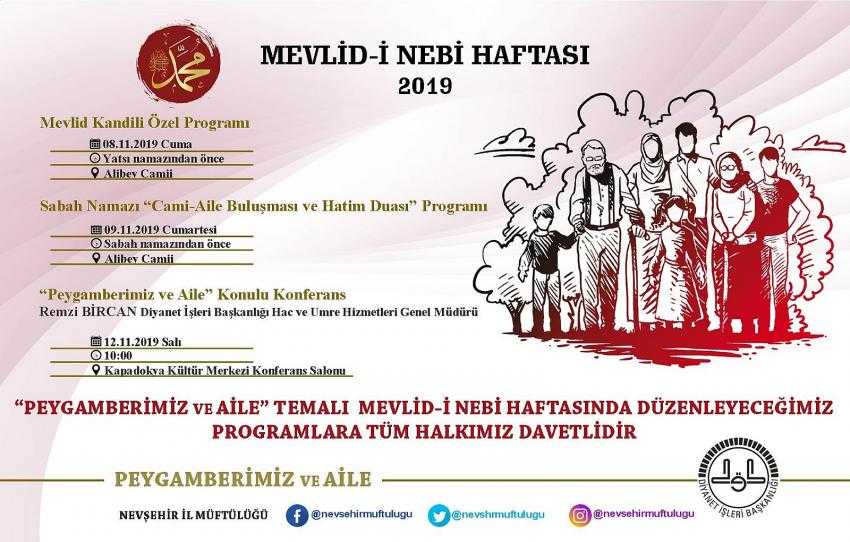 Peygamber Efendimizin doğduğu, alemleri ve dünyamızı şereflendirdiği günün içinde yer aldığı Mevlid-i Nebi Haftası bu yıl 8 Kasım Cuma günü başlayacak. Mevlid-i Nebi etkinliklerini bir haftaya yayılarak Nevşehir İl Müftülüğü ve İlçe Müftülükleri tarafından, il merkezi ve ilçelerde konferans ve paneller tertip edilecek. Mevlid-i Nebi etkinlikleri kapsamında ceza-infaz kurumları, huzurevleri, çocuk/sevgi evleri, hastaneler, gençlik merkezleri, liseler ve yükseköğretim kurumları, öğrenci yurtları, geçici barınma merkezleri, engelli rehabilitasyon merkezleri vb. mekanlarda etkinlikler yapılacak.