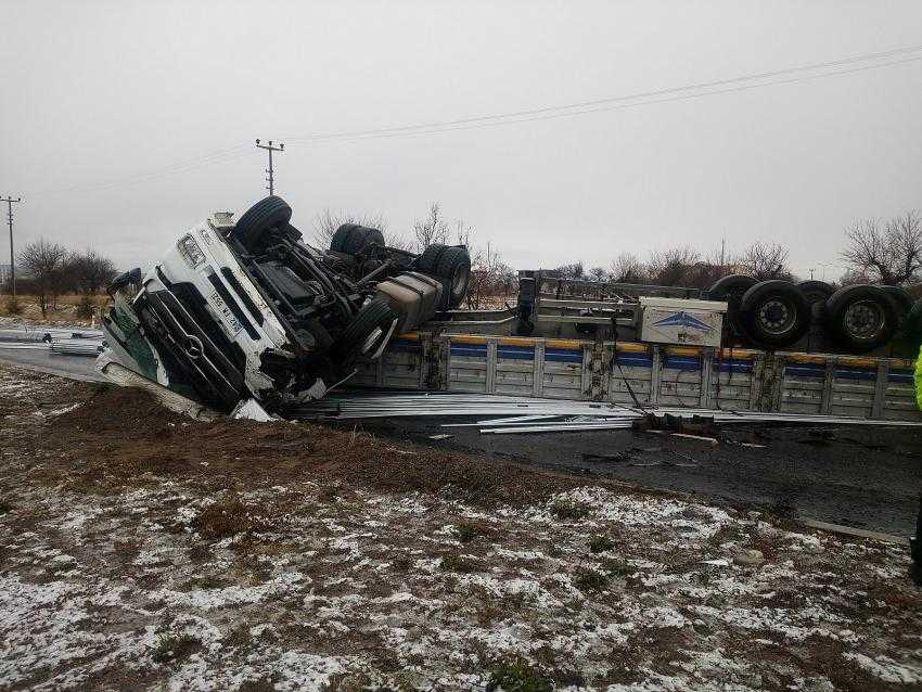 Nevşehir’den Aksaray’a gitmekten olan 42 FM 552 plakalı tır sürücüsü Acıgöl’de direksiyon hakimiyetini kaybetmesi sonrasında devrildi.