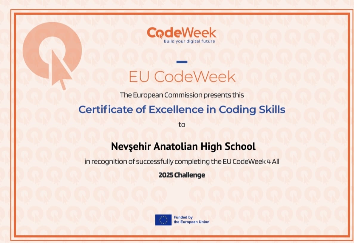 Nevşehir Anadolu Lisesi, 8 farklı ülkeden ortakların katılımıyla yürütülen Empathy in Action: Life Skills Against Bullying projesi kapsamında katıldığı Code Week etkinlikleri sonucunda “Mükemmeliyet Sertifikası” almaya hak kazandı.