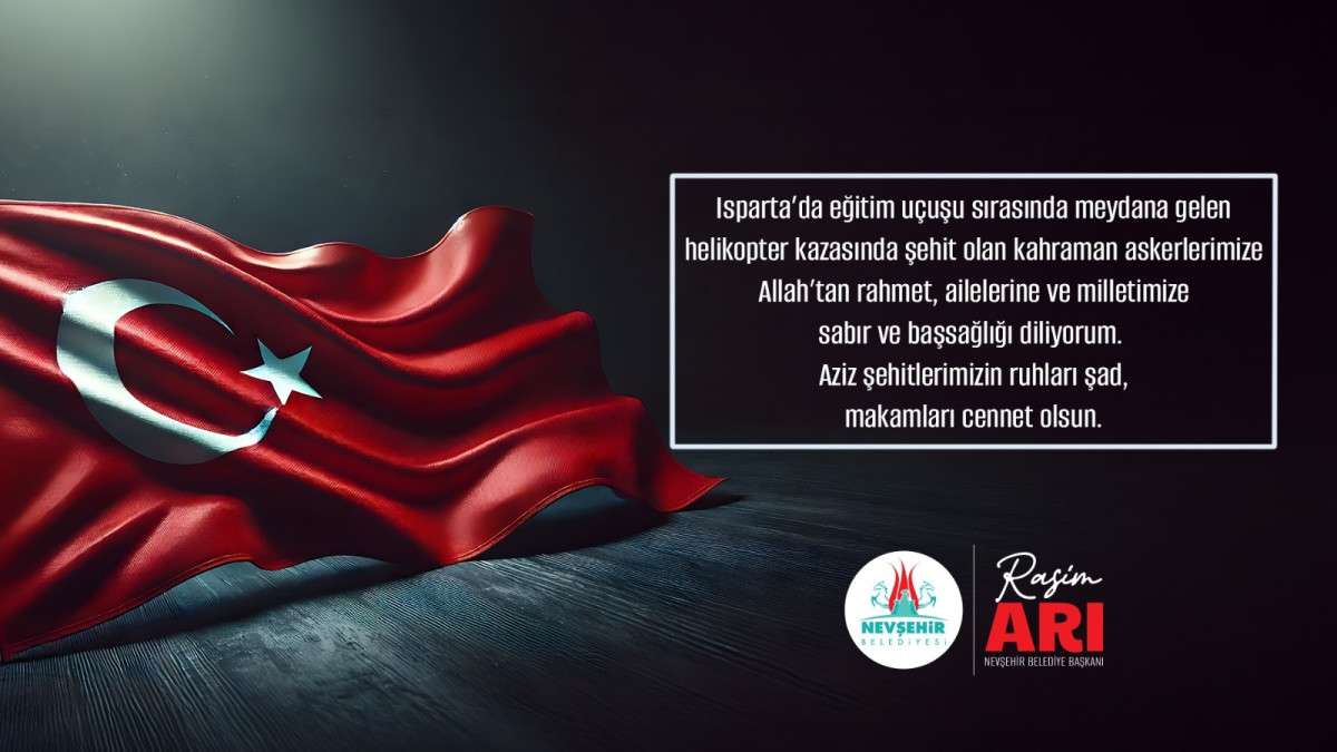 Nevşehir Belediye Başkanı Rasim Arı, Isparta’da meydana gelen helikopter kazası sonrası şehit olan askerlerimize taziye mesajı yayınladı.