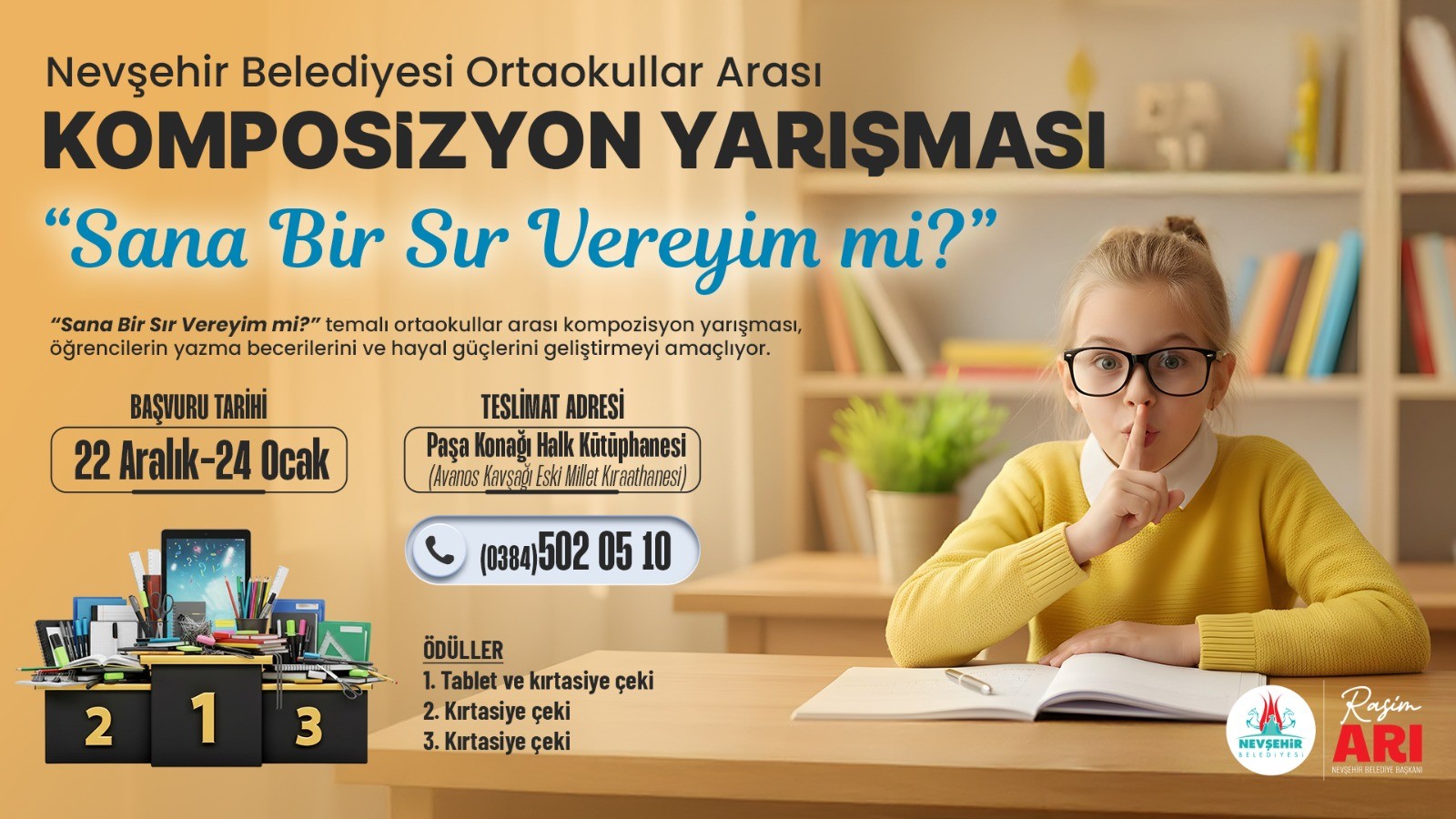 Nevşehir Belediyesi tarafından Ortaokullar arası “Sana Bir Sır Vereyim mi?” temalı kompozisyon yarışması düzenlenecek.