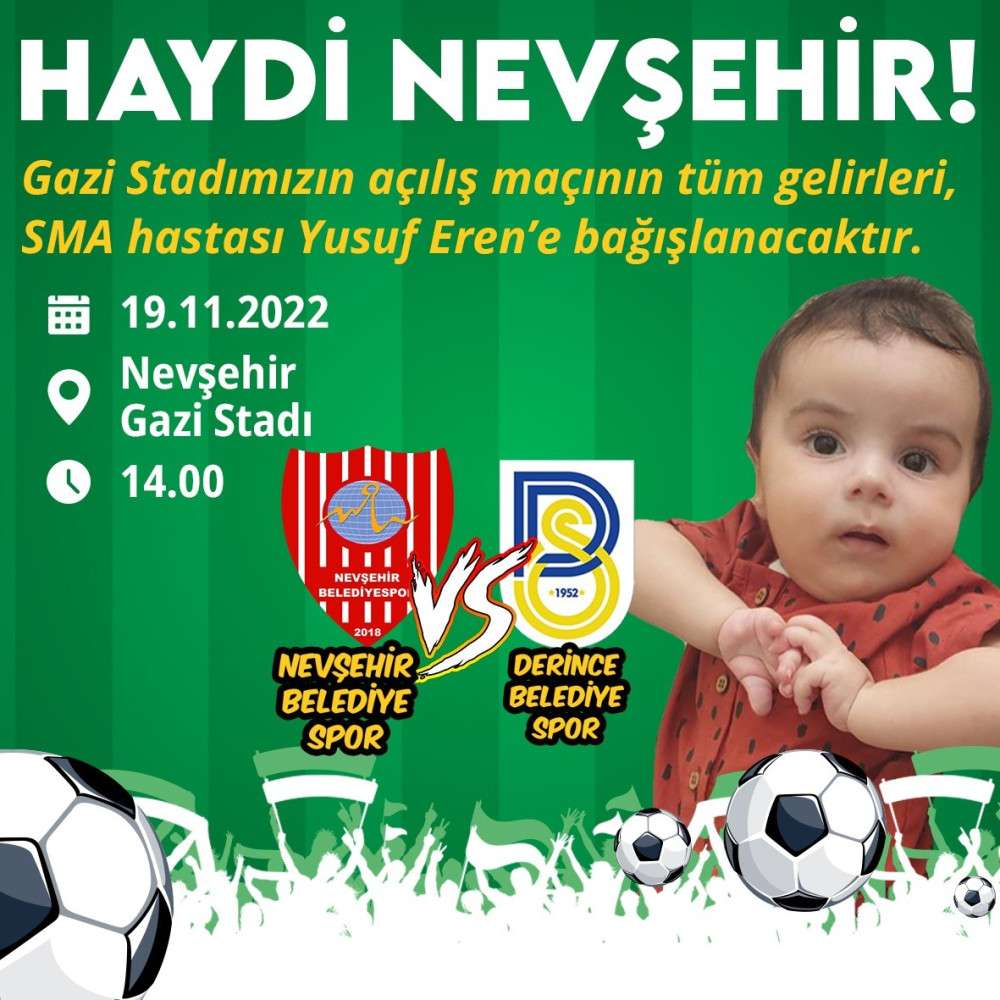 Nevşehir Belediyespor Kulüp Yönetimi, hafta sonu Gazi Stadı’nda oynanacak olan Nevşehir Belediyespor-Belediye Derincespor maçının tribün gelirlerinin SMA hastası Yusuf Eren’e bağışlanacağını açıkladı.