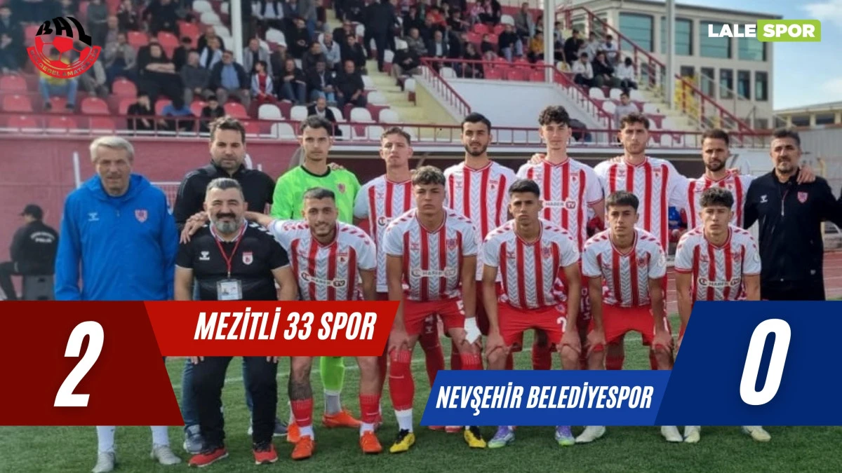 Bölgesel Amatör Lig 6.Grupta mücadele eden Nevşehir Belediyespor ligin 11.haftasında Mersin deplasmanında Mezitli 33 Spor ile karşılaştı. Karşılaşmanın 37.dakikasında Mezitli 33 Spor Enes Aslanetepe’nin kaydettiği gol ile maçta 1-0 öne geçerken karşılaşmada ilk yarı da 1-0 Mezitli 33 Spor’un üstünlüğü ile tamamlandı.