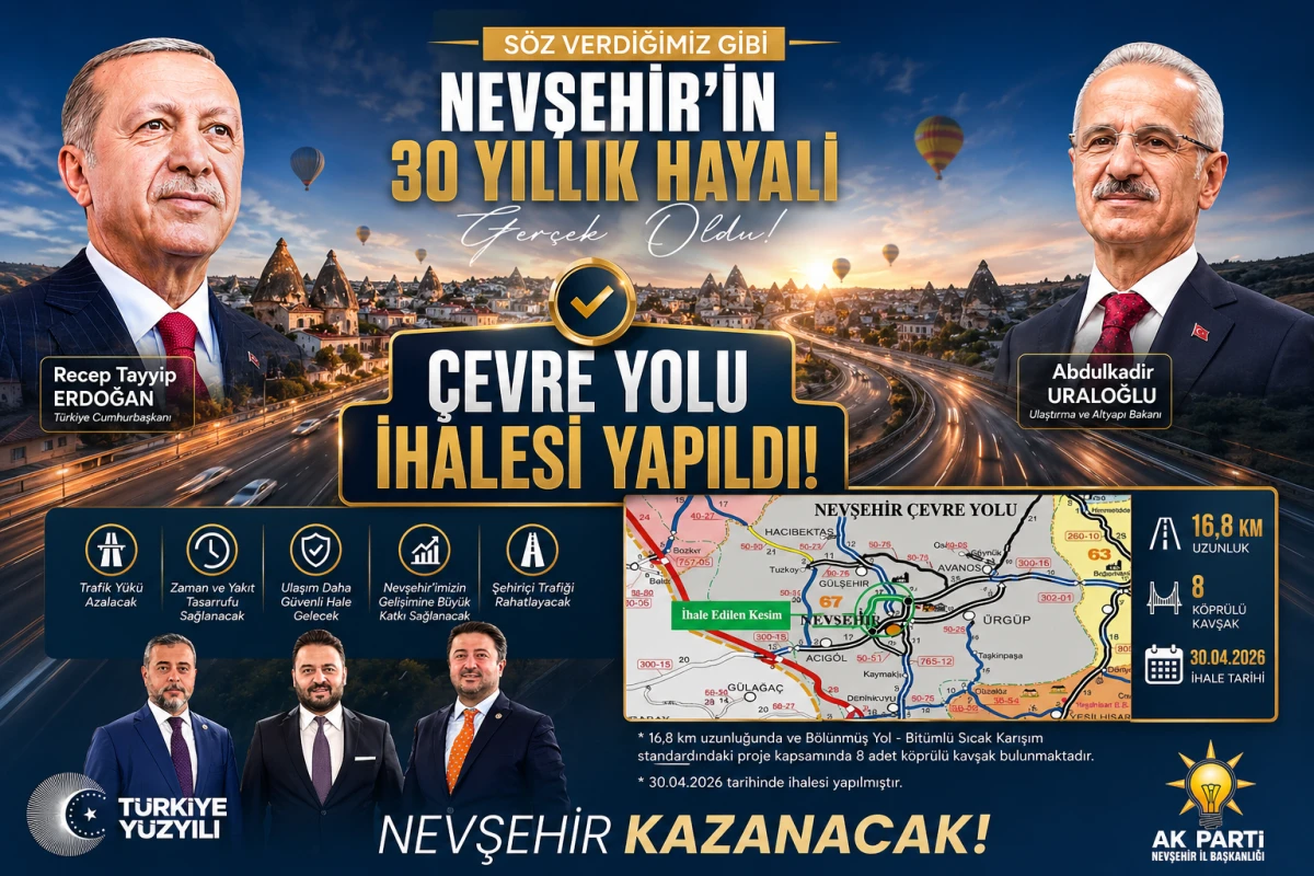 AK Parti Milletvekili Çalışkan açıklamasında, “ Nevşehir’imiz yıllardır bekledi. Ve biz söz verdiğimiz gibi o bekleyişi bitiriyoruz. Nevşehir Çevre Yolu Projesi’nin ihalesi 30.04.2026 (bugün) gerçekleştirildi. 16,8 km uzunluğunda, 8 köprülü kavşaklı bu büyük proje ile şehrimizin ulaşımı rahatlayacak. Nevşehir yeni bir döneme adım atacak. Bu sadece bir yol değil, Nevşehir’imizin geleceğine atılan güçlü bir adımdır. AK Parti Nevşehir olarak, söz verdik, takip ettik. Ve bugün o sözün gereğini yerine getiriyoruz. Bu şehre ne söz verdiysek yapmaya, Nevşehir için durmadan, yorulmadan çalışmaya devam edeceğiz. Nevşehir Kazanacak. Bu büyük yatırım için Cumhurbaşkanımız Recep Tayyip Erdoğan başta olmak üzere Ulaştırma ve Altyapı Bakanımız Abdulkadir Uraloğlu’na teşekkür ediyoruz” dedi.