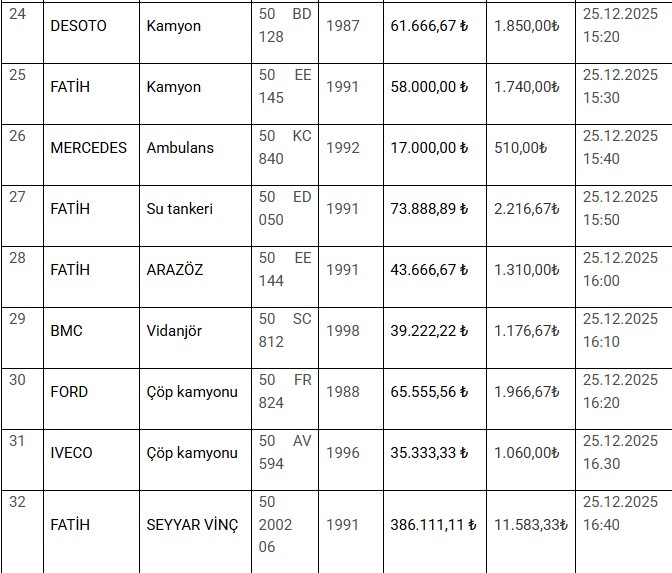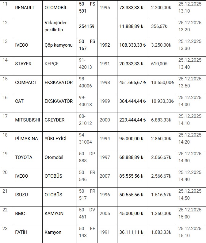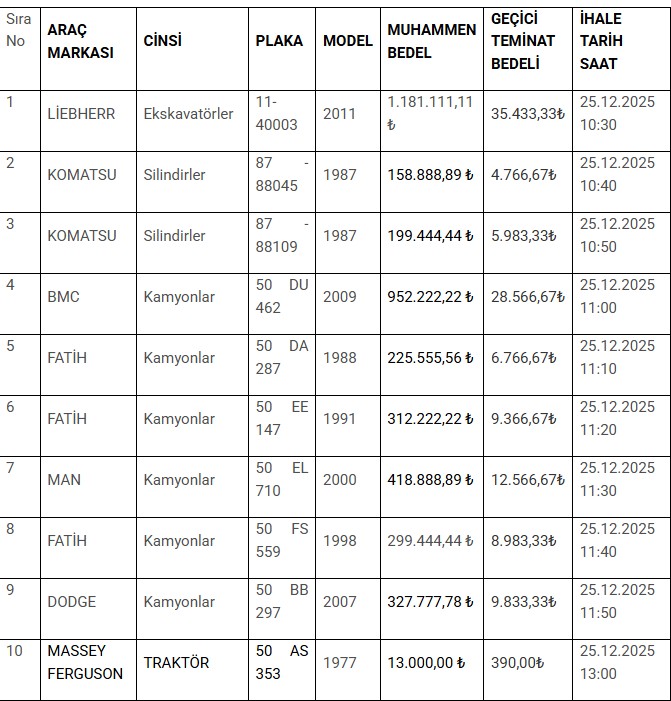 1) Aşağıda plaka No, marka ve model/model yılı belirtilen Nevşehir İl Özel İdaresine ait araçların belirlenen muhammen bedel üzerinden 2886 sayılı Devlet İhale Kanunu'nun 45. Maddesine göre Açık Teklif usulü ihale sonrası satışı yapılacaktır. İhale İl Encümenince, 25.12.2025 Perşembe günü saat 10.30da 15 Temmuz Mahallesi Zübeyde Hanım Caddesi 65:2, İl Özel İdaresi Encümen Toplantı Salonunda 10 dakika ara ile yapılacaktır.