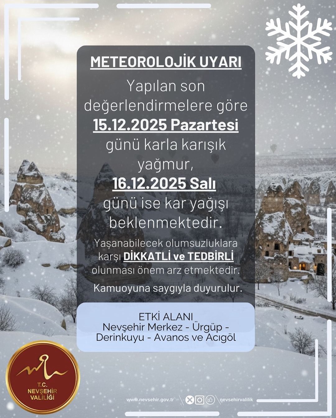 Nevşehir Valiliği tarafından 15 Aralık Pazartesi günü karla karışık yağmur yağışı ve 16 Aralık Salı günü kar yağışına karşı vatandaşları uyardı.