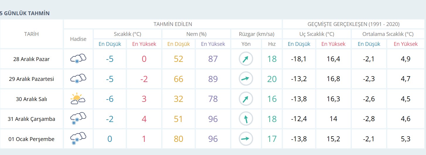 28 Aralık Pazar günü hafif kar yağışı bekleniyor. Günün en yüksek hava sıcaklığı 0 derece en düşük hava sıcaklığının ise -5 derece olması tahmin ediliyor.