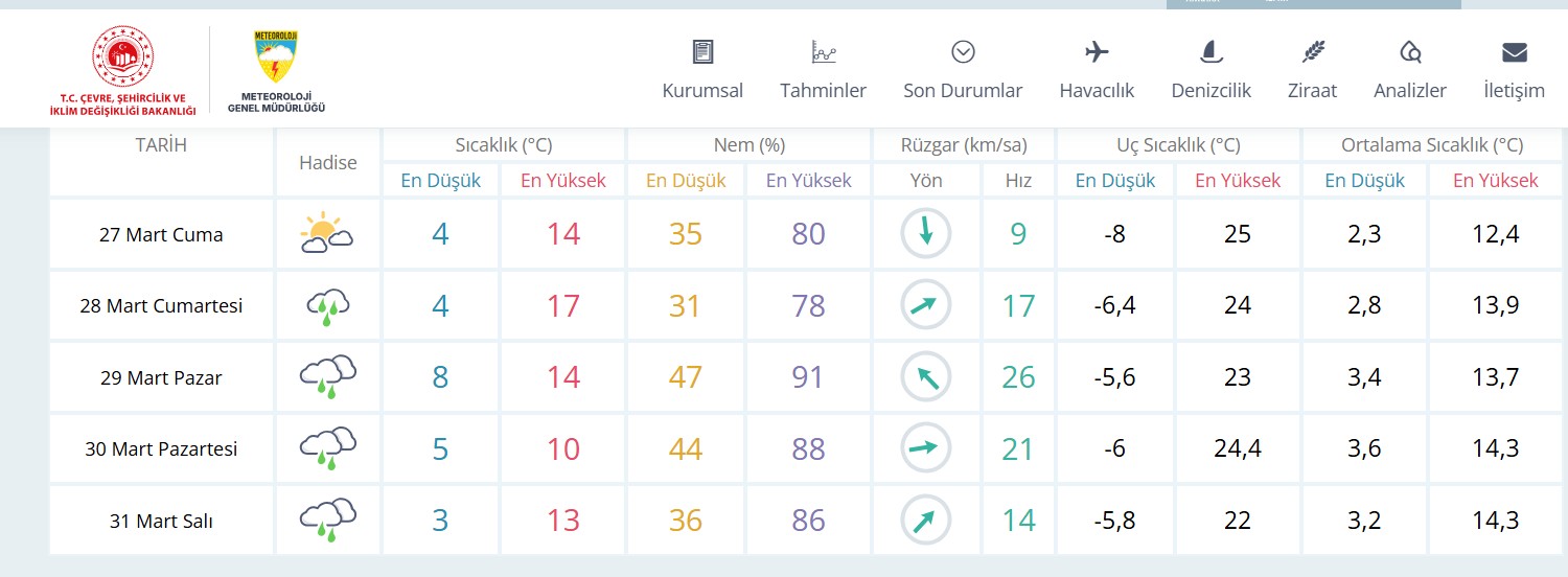29 Mart Pazar günü yağışlı hava devam edecek. Günün en yüksek hava sıcaklığı 14 derece en düşük hava sıcaklığının ise 8 derece olması tahmin ediliyor.