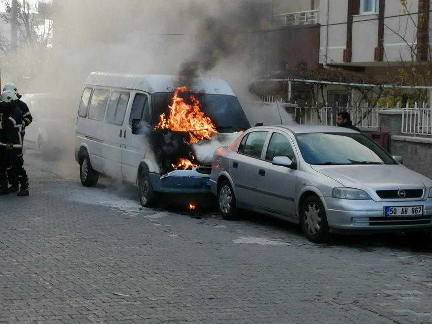 Nevşehir Sümer mahallesinde park halinde bulunan minibüs alev alması paniğe neden oldu.