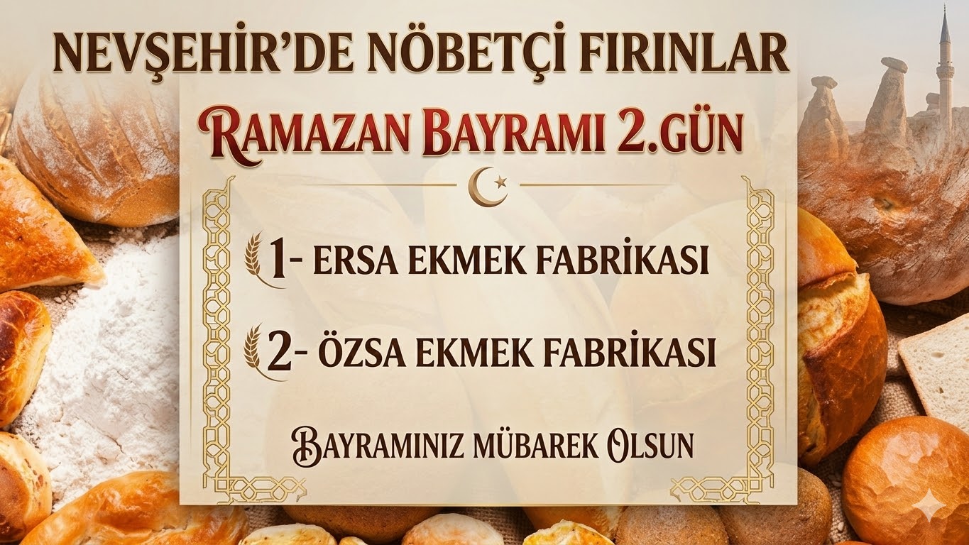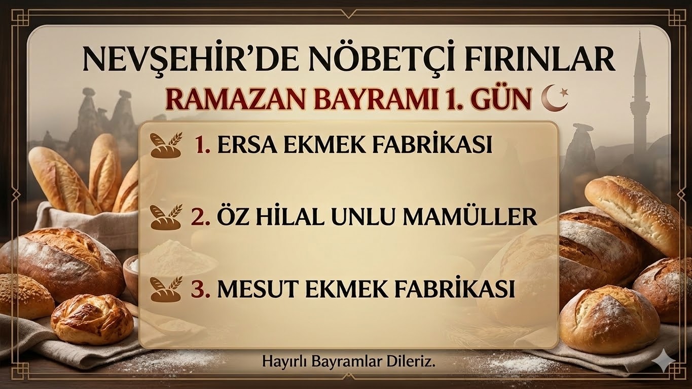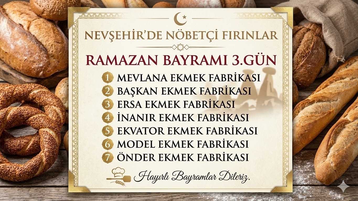 Nevşehir Fırıncılar Odası Başkanlığı tarafından Ramazan Bayramı dolayısıyla hizmet verecek olan nöbetçi fırınlar açıklandı. Ramazan Bayramı’nın ilk gününde 3 fırın hizmet verecekken bayramın ikinci gününde ise 2 fırın hizmet verecek. Ramazan Bayramı’nın son günü olan 22 Mart Pazar günü ise 7 fırın hizmet verecek.