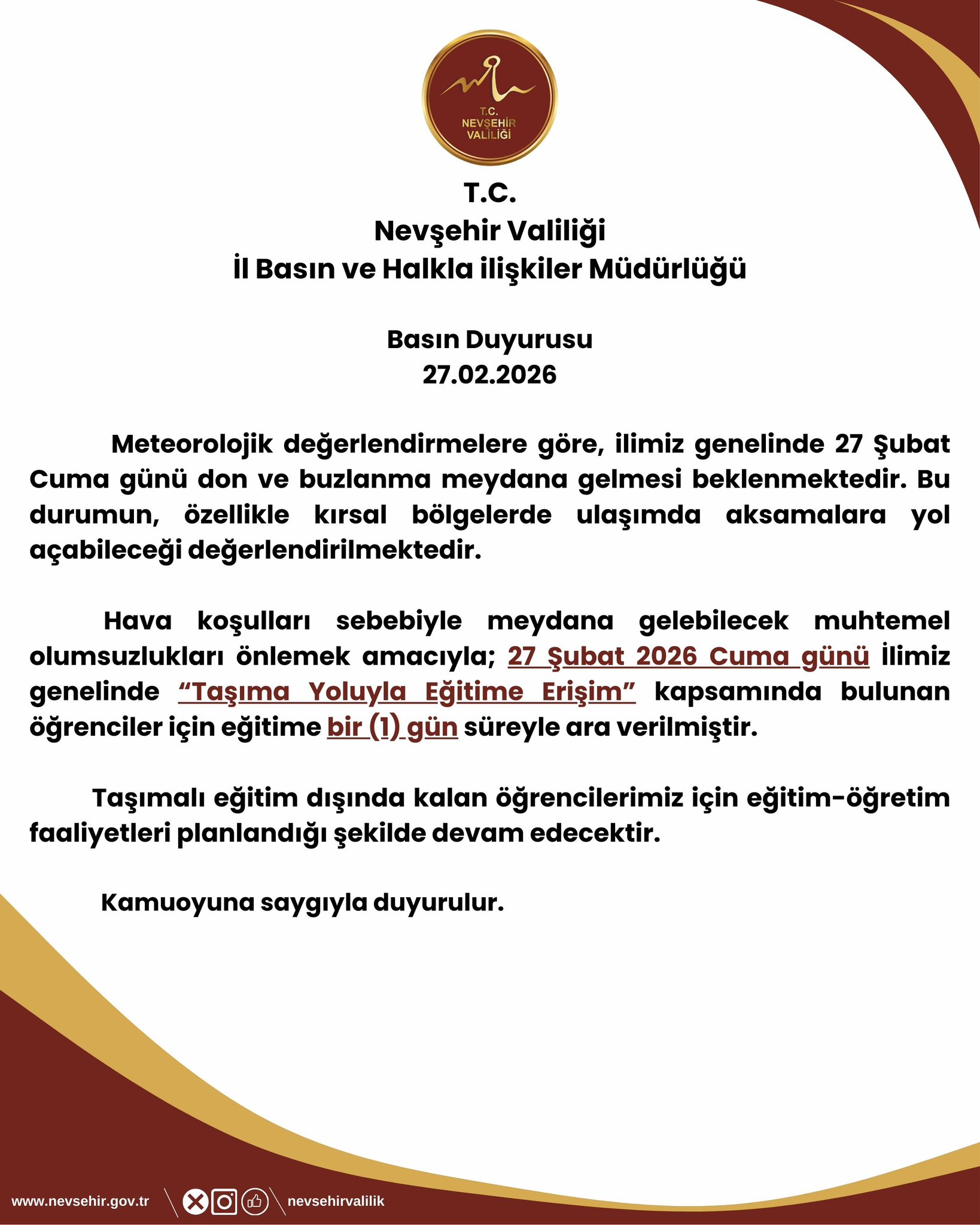 Nevşehir Valiliği’nden yapılan açıklamada, “Meteorolojik değerlendirmelere göre, ilimiz genelinde 27 Şubat Cuma günü don ve buzlanma meydana gelmesi beklenmektedir. Bu durumun, özellikle kırsal bölgelerde ulaşımda aksamalara yol açabileceği değerlendirilmektedir. Hava koşulları sebebiyle meydana gelebilecek muhtemel olumsuzlukları önlemek amacıyla; 27 Şubat 2026 Cuma günü ilimiz genelinde “Taşıma Yoluyla Eğitime Erişim” kapsamında bulunan öğrenciler için eğitime bir (1) gün süreyle ara verilmiştir. Taşımalı eğitim dışında kalan öğrencilerimiz için eğitim-öğretim faaliyetleri planlandığı şekilde devam edecektir” ifadelerine yer verildi.