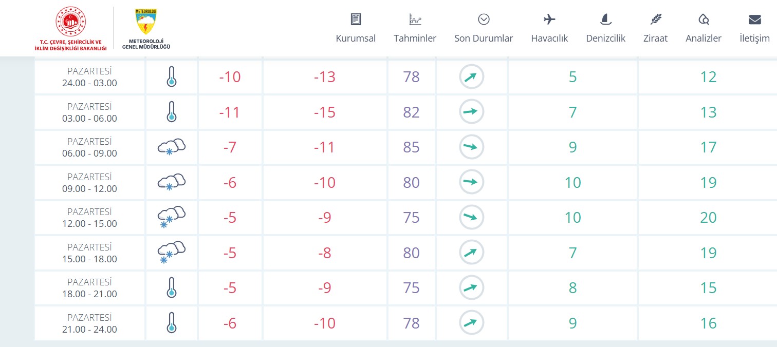 Meteoroloji Genel Müdürlüğü tarafından yapılan son değerlendirmelere göre 19 Ocak Pazartesi günü gece saatlerinde hava sıcaklıkları -15 dereceye kadar düşecekken sabah saatlerinde ise soğuk hava yerini kar yağışına bırakacak. Sabah saatlerinde başlayacak olan kar yağışı akşam saat 18.00’e kadar devam edecekken akşam 18.00 ila 00.00 saatleri arasında ise yine soğuk hava etkili olacak.