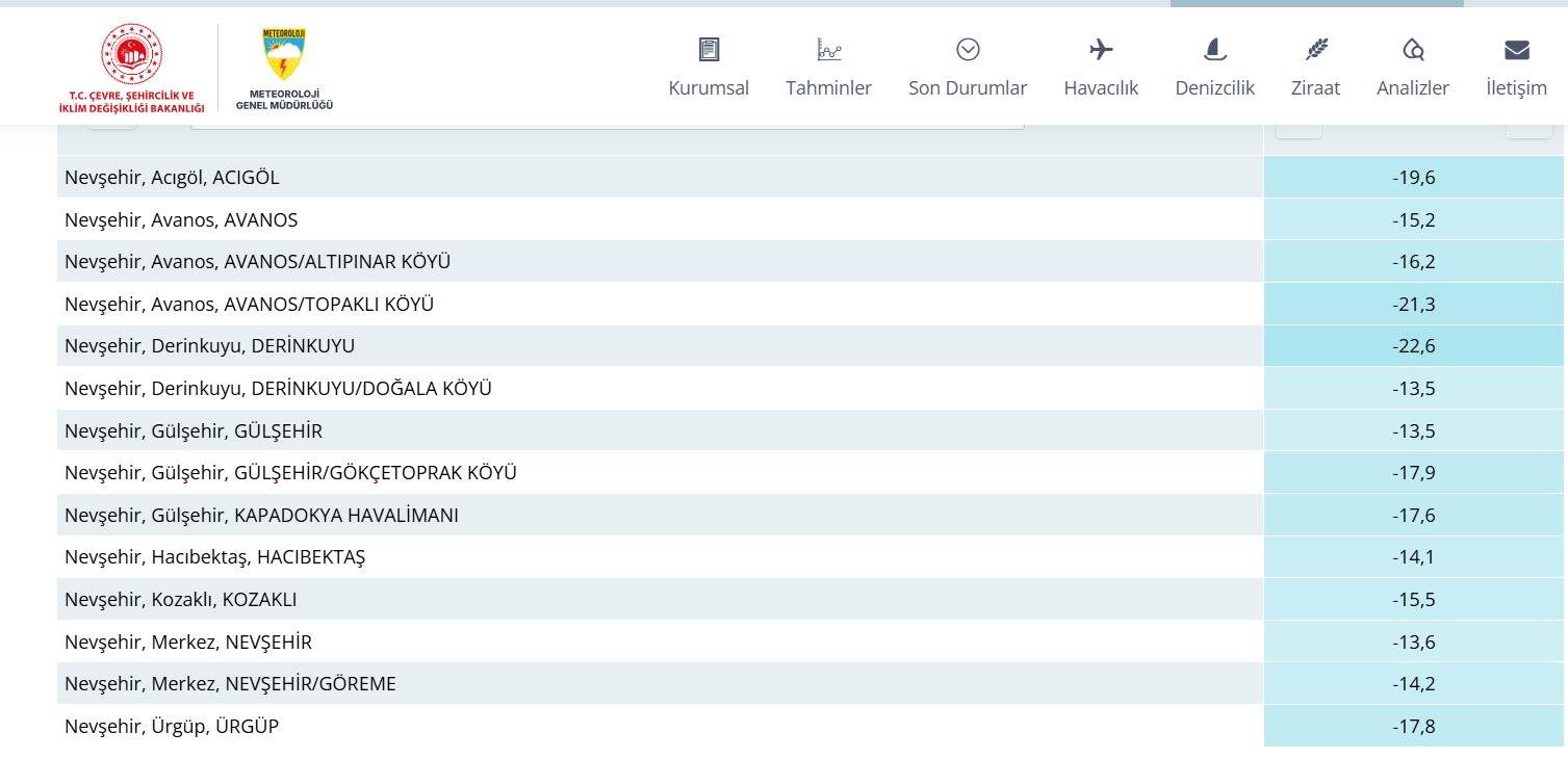 Meteoroloji Genel Müdürlüğü tarafından yapılan son değerlendirmelere göre Nevşehir dün adeta buz tuttu. Nevşehir’in en soğuk ilçesi -22,6 derece ile Derinkuyu ilçesi olduğu açıklanırken, Topaklı köyü -21,3 derece, Acıgöl ilçesi -19,6 derece, Gökçetoprak köyü -17,9, Ürgüp ilçesi -17,8, Kapadokya Havalimanı -17,6 ile en soğuk bölgeler oldu.