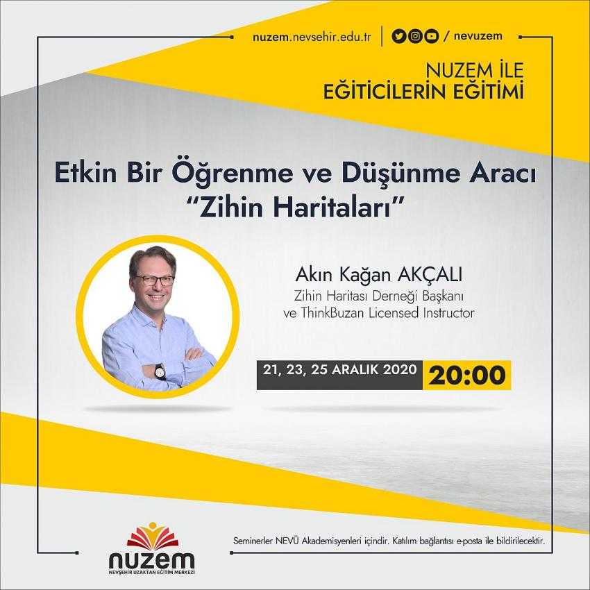 Nevşehir Hacı Bektaş Veli Üniversitesi (NEVÜ) Uzaktan Eğitim Uygulama ve Araştırma Merkezi (NUZEM) ile “Eğiticilerin Eğitimi” seminerlerine bu hafta Zihin Haritası Derneği Başkanı Akın Kağan Akçalı konuk olacak.