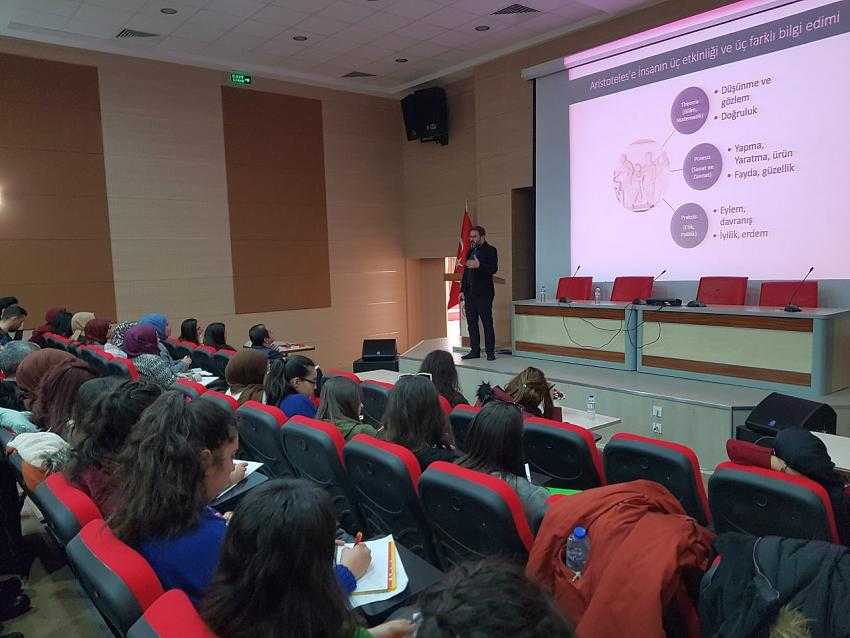 Fen Bilimleri Eğitimi alanında öğrenim gören lisans, yüksek lisans ve doktora öğrencilerine yönelik düzenlenen konferansta, bilim ve felsefenin kısa tarihsel serüveni, son iki yüzyılda bilimde paradigma dönüşümü konuları hakkında bilgi veren Dr. Sarıtaş, konferansın son bölümde bu dönüşümün eğitim bilim çalışmalarına nasıl yansıdığına yönelik değerlendirmelerde bulundu.